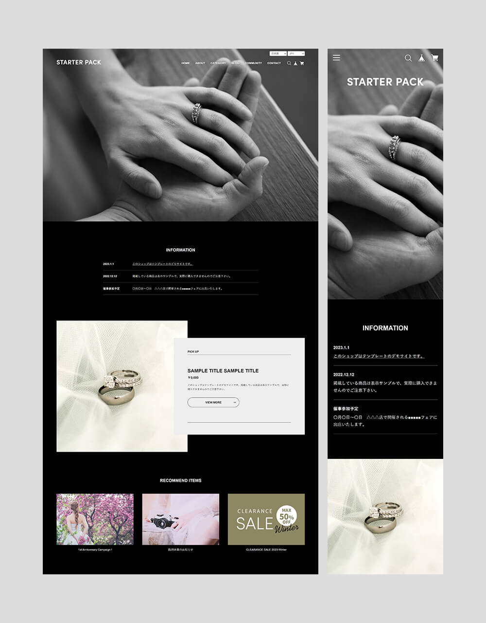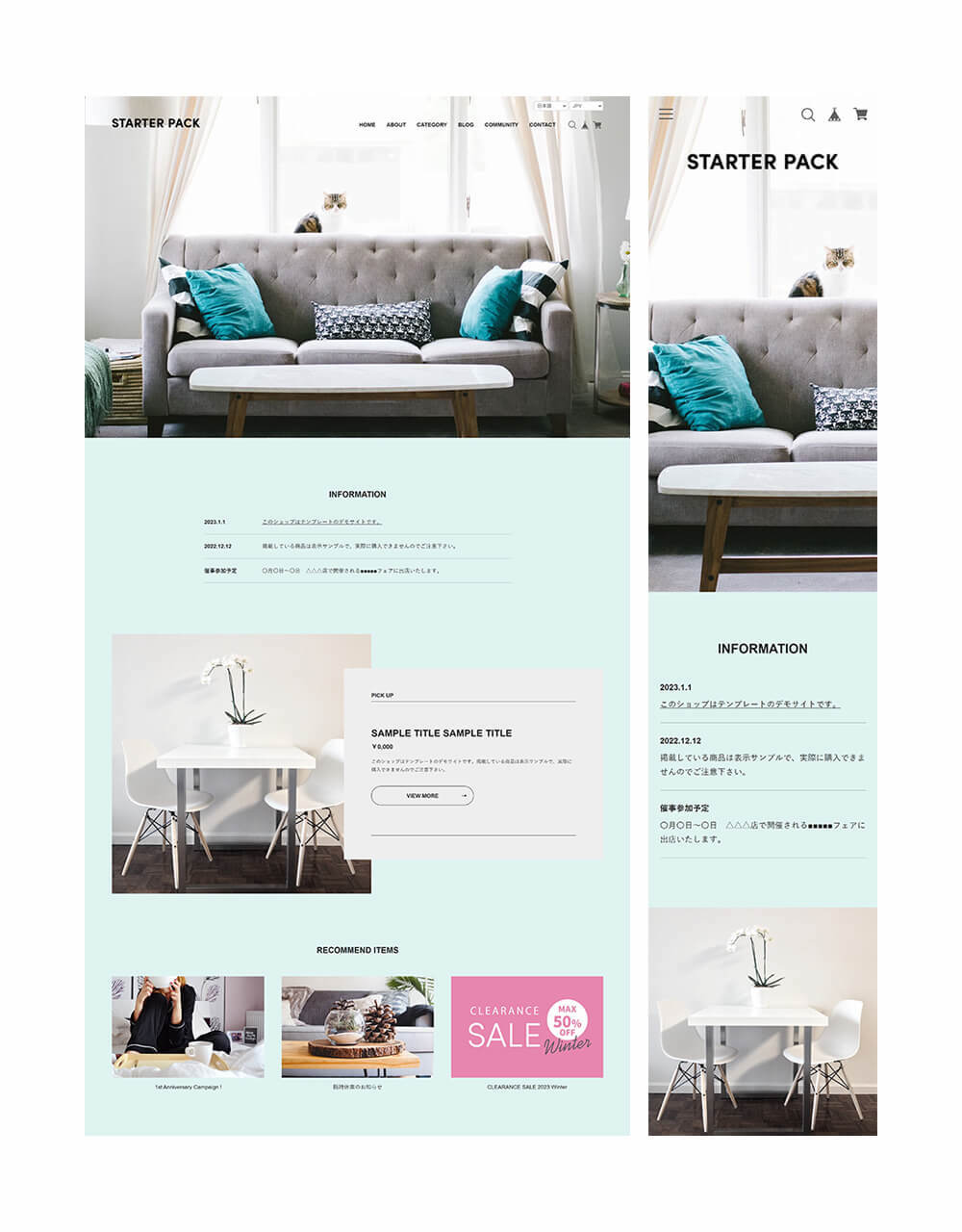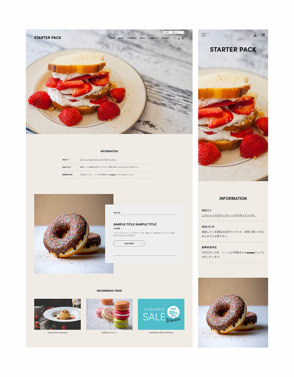 「スターターパック ( Starter Pack )」は、初めてネットショップを立ち上げる方に最適なデザインや機能を持っています。レスポンシブウェブデザインが採用されているため、スマホやタブレットからの閲覧にも最適化され、一貫したユーザー体験を提供します。
