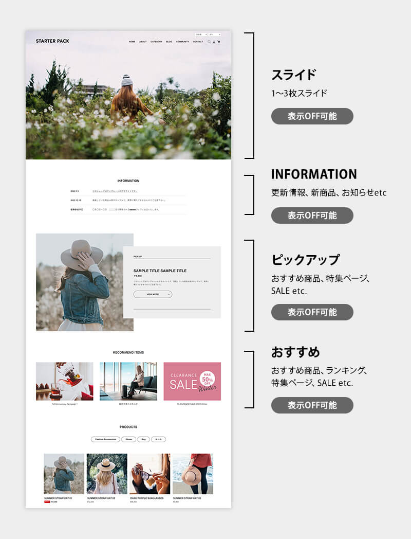 詳しくは、BASEデザインテンプレート「スターターパック ( Starter Pack )」説明ページをご覧ください。