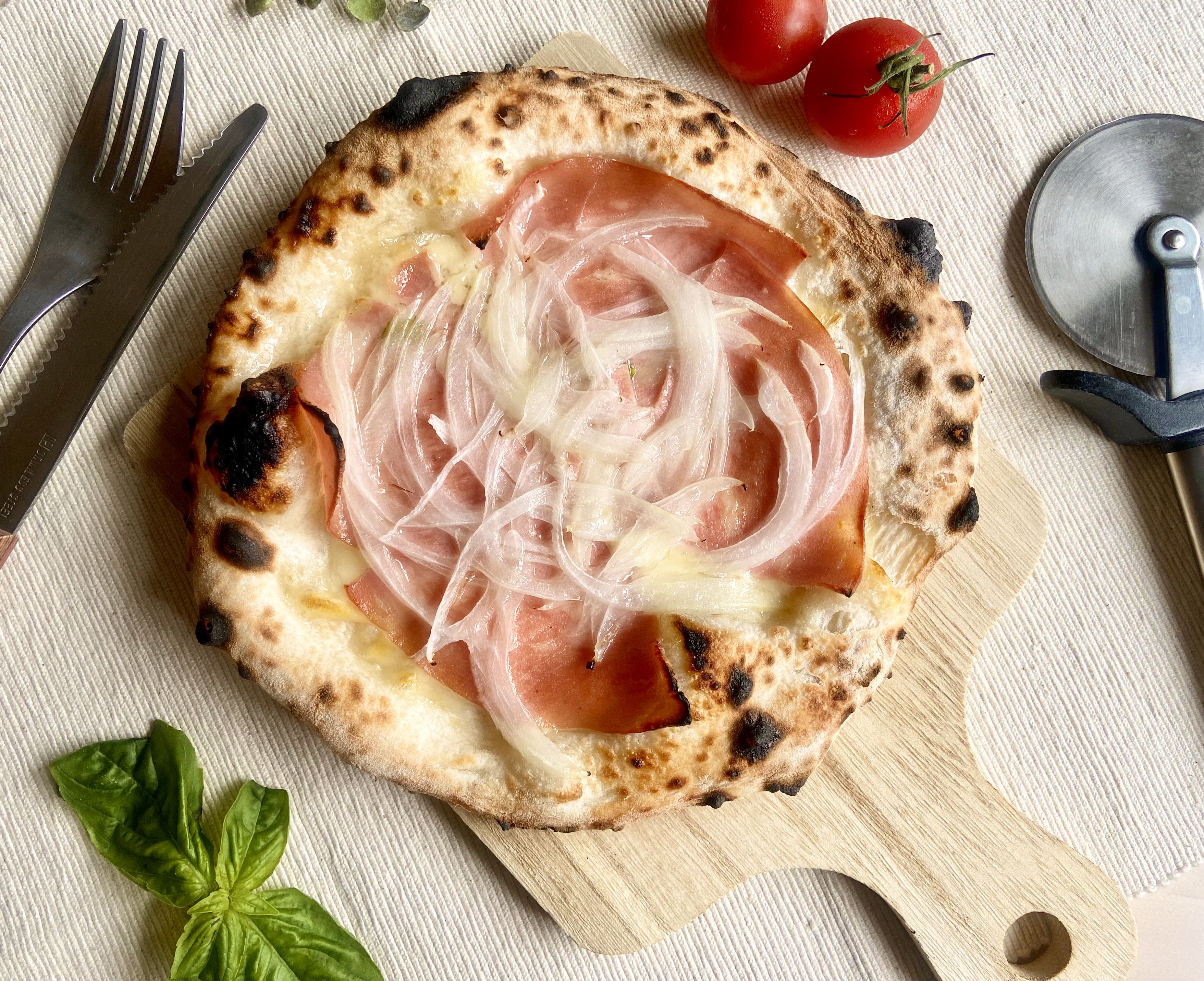 ■泉州玉ねぎとモルタデッラハムのピザ (740円税込) 水分が多く甘みがあり、肉厚で柔らかい泉州たまねぎを使用し、上品な味わいに仕上げております。泉州玉ねぎは大阪府下1番の出荷量を誇ります。