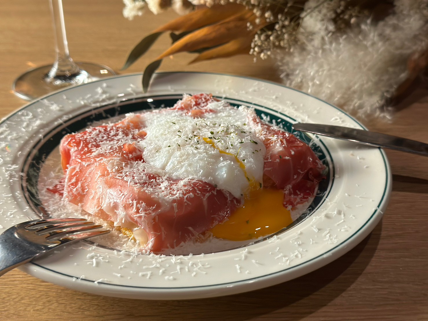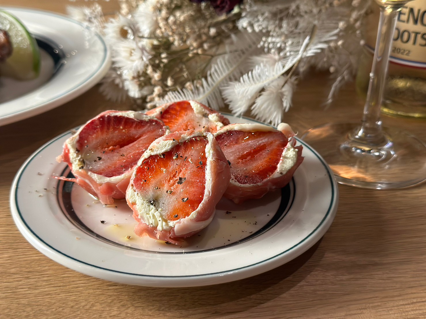 料理は、「イチゴ大福~生ハムクリームチーズ~」(649円)、「accentカロッツァ ~生ハムとペコリーノチーズ~」(1,408円)などチーズを使ったものや、「牛ランプのステーキ 季節野菜を添えて」(2,420円)、「鶏モモ肉のコンフィ」(1,078円)の肉料理など約40種類。