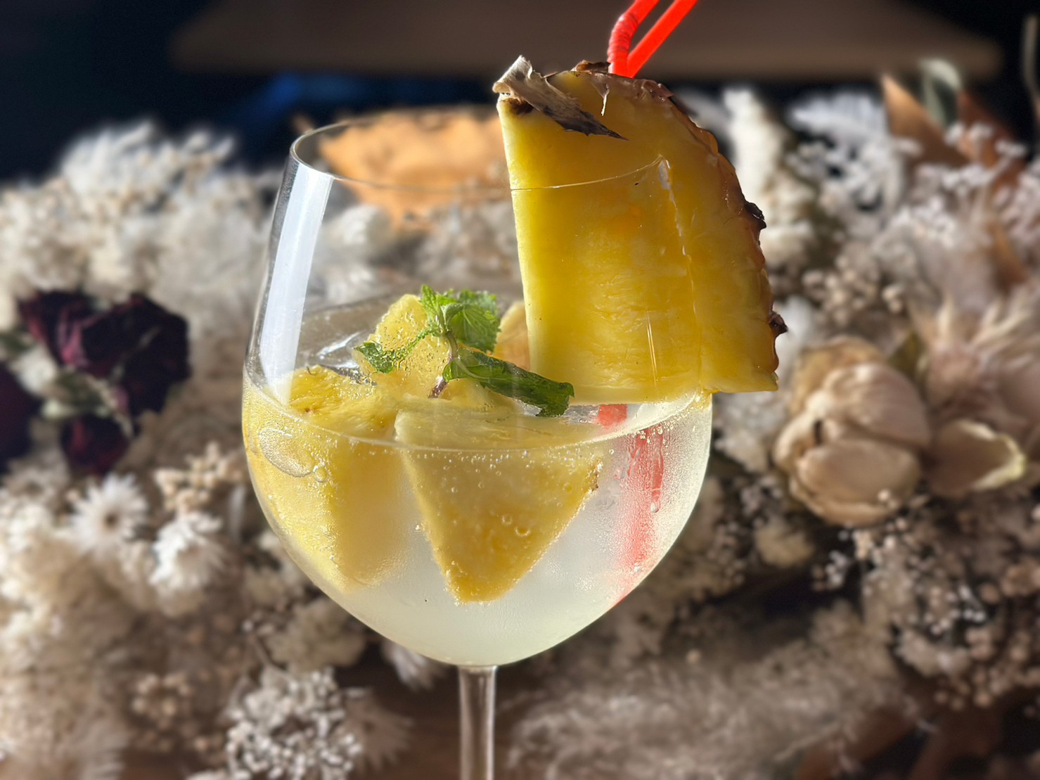 ドリンクは、生ビール(550円)やハイボール(440円~)、ワイン(グラス=500円~、ボトル=2,000円~)など約50種類。スパークリングワインが入ったグラスに生フルーツをのせた「枡スパークリング」(4種、各748円)もおすすめです。