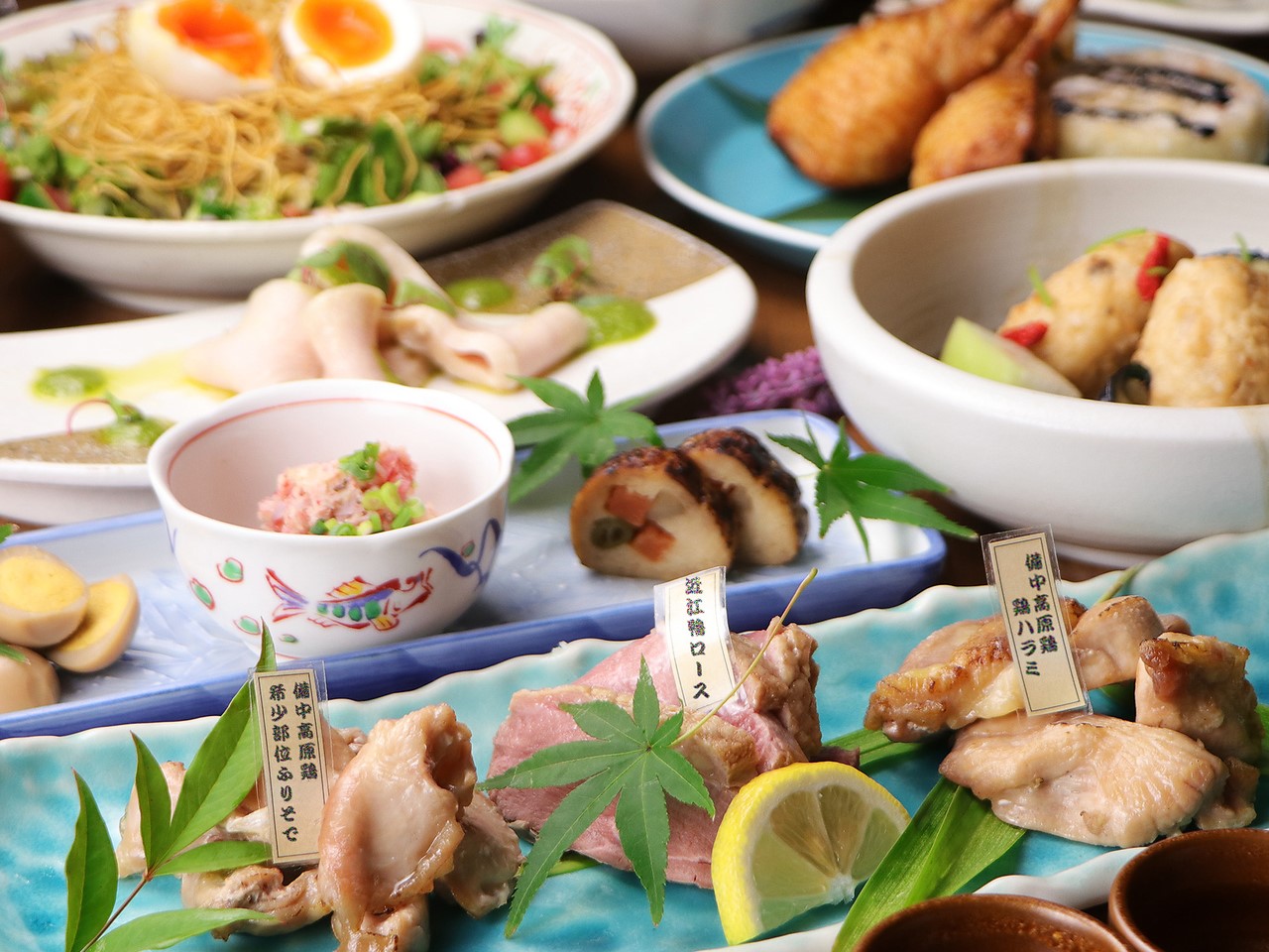 豪華鶏づくし「備中高原鶏 希少部位振袖・鶏ハラミの焼物」や「卵たっぷりのチキン南蛮」「低温調理の鶏胸肉のカルパッチョ」など充実の全10品ご用意。鶏っくで人気の鳥料理をご堪能して頂けます!種類豊富な2時間飲み放題付き。(※LO30分前)