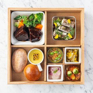 すべてのコース料理につく前菜で、「ローストビーフと焼き茄子」や「いちじくの白和え」など6種類の前菜を木箱に詰めてご提供。