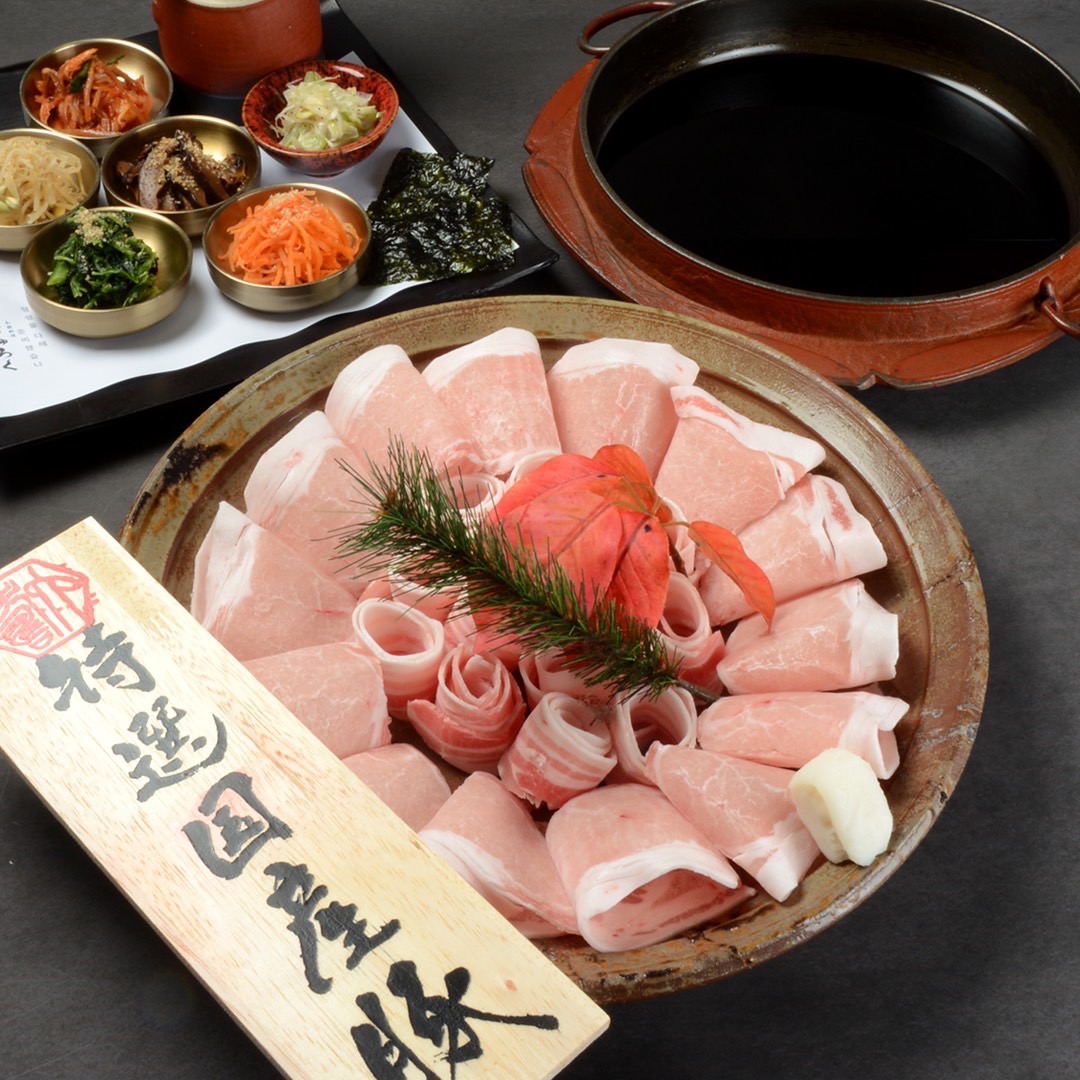 2種類の豚肉の違いを楽しめる、2種類の鍋をご用意。「豚・韓しゃぶ」(3,080円)は、韓国の漢方薬・ファンギを入れた和出汁でお肉をしゃぶしゃぶし、お好みの「パンチャン」を巻いて特製ポン酢ダレで召し上がっていただきます。「和韓・豚 プルコギ」(3,080円)は、牛脂を塗った鉄板で豚肉を1枚ずつ焼き、日本の味噌と韓国の味付け味噌「タテギ」を掛け合わせた割下を注ぎ入れ、「パンチャン」を加え、お好みで卵を絡ませます。どちらの鍋も、海鮮チジミやサムギョプサルなど全7品のコース(各4,880円)でもご用意しています。