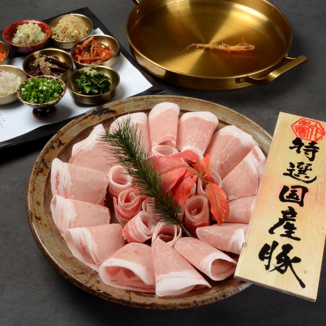 今回、薄切りの豚肉を「パンチャン」(ナムル盛り合わせ)とともに食べる新感覚の鍋メニュー2種をご提供します。使用する豚肉は、あっさりとした脂身ともっちりとした食感が特徴の福岡・うきは銘柄豚「みのう豚」と、みずみずしくやわらかい食感の「鹿児島黒豚」です。