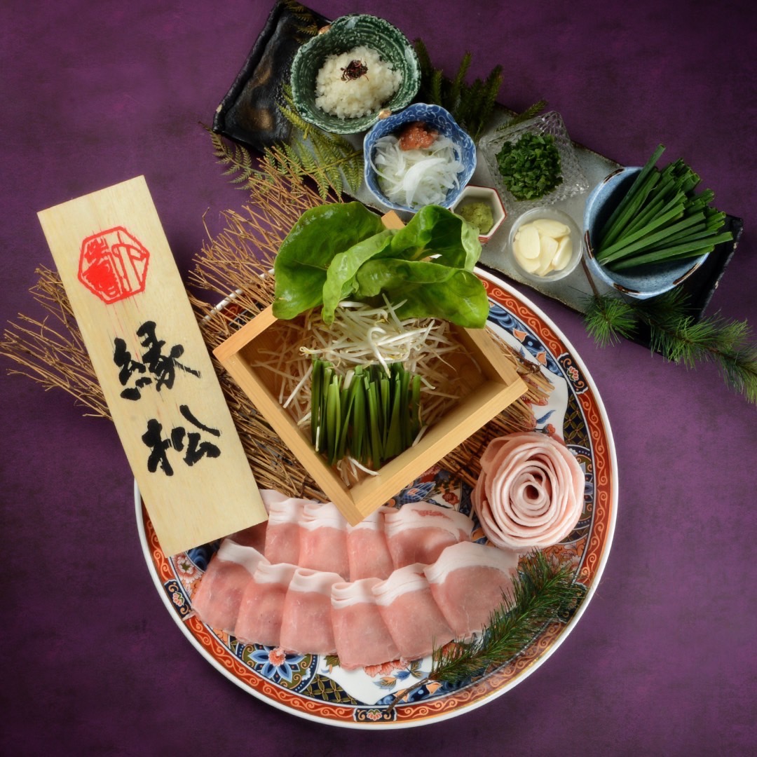 「縁松豚肉セット」(3,400円)は、2種類の豚肉を出汁にくぐらせ、鉄板で焼き上げる日本初の“豚焼きしゃぶ”を提供。販売開始1カ月で100食を突破し、大変好評いただいています。