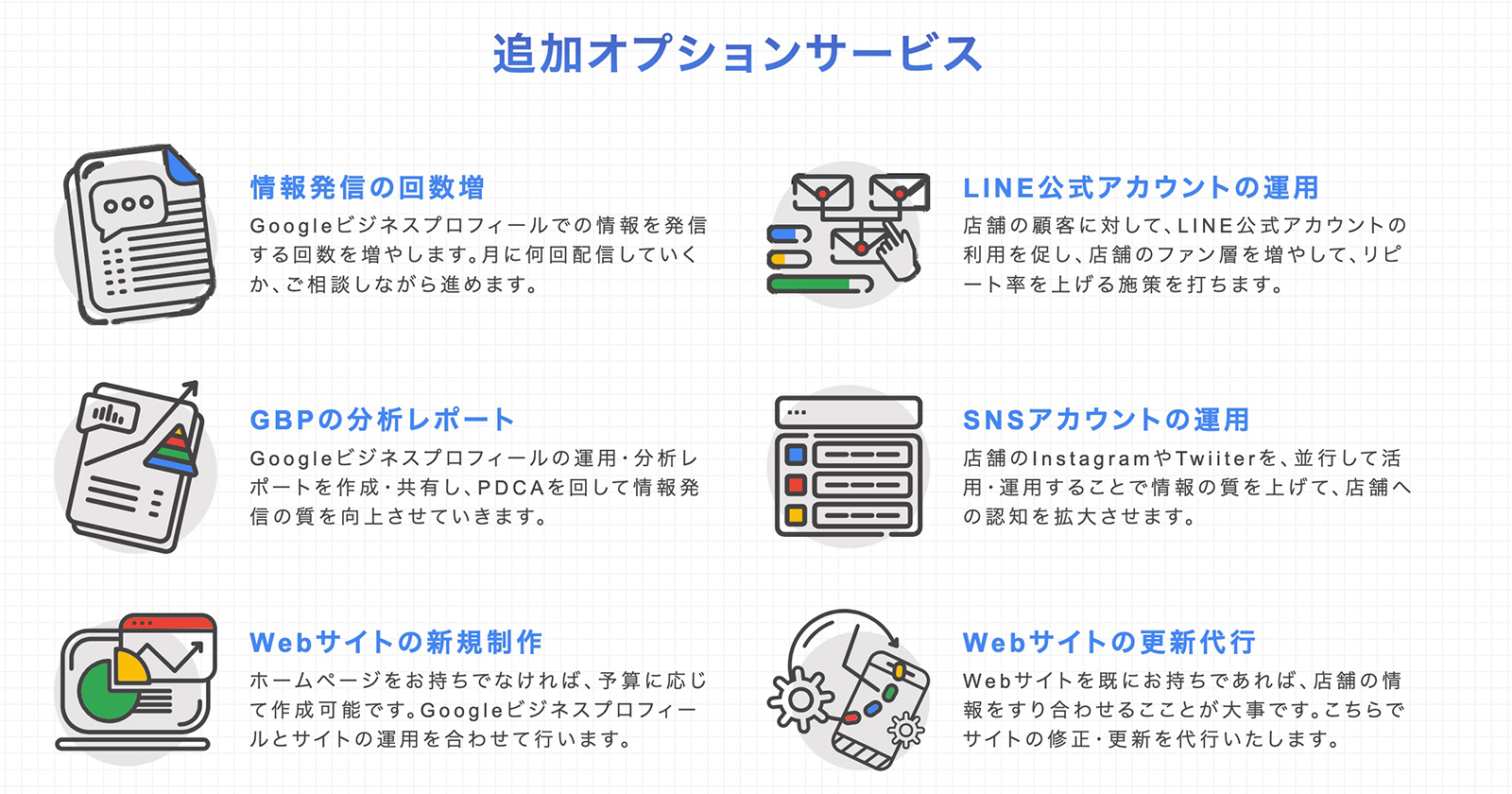 MEO対策はもちろん、SEO対策やSNSマーケティング、LINE公式アカウント運用、ホームページ制作など、関連するWebマーケティングをワンストップで提供することが可能です。お客様の事業にとって本当に必要なニーズに応じて、オーダーメイドのWeb集客をご提案いたします。