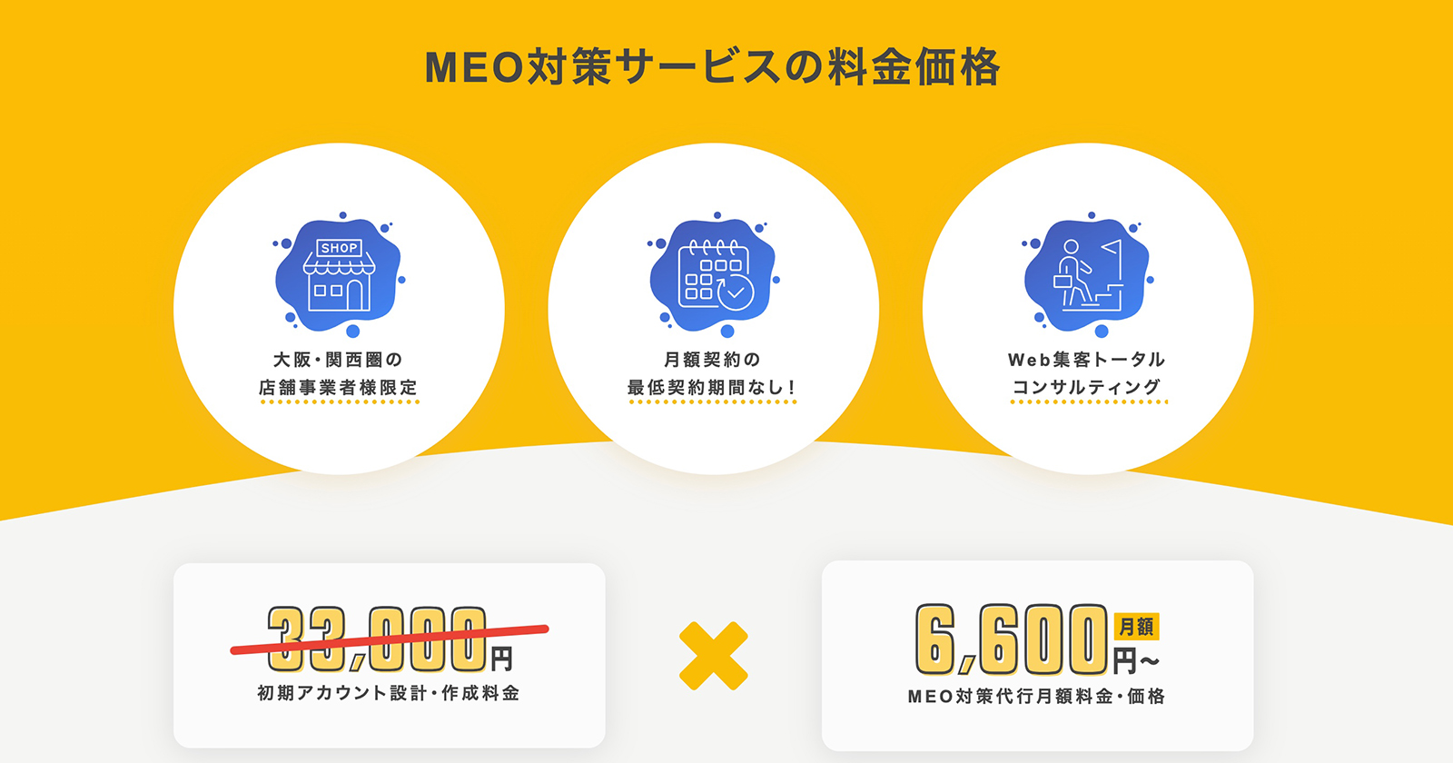 一般的に、月額契約は最低契約月数は決まってるものですが、当社のMEO対策サービスは契約期間の縛りは設定しておりません。効果を感じていただけなければ、いつでも解約可能となっております。ですので、まずはお気軽にお話を聞くところから始めさせていただきたいです。