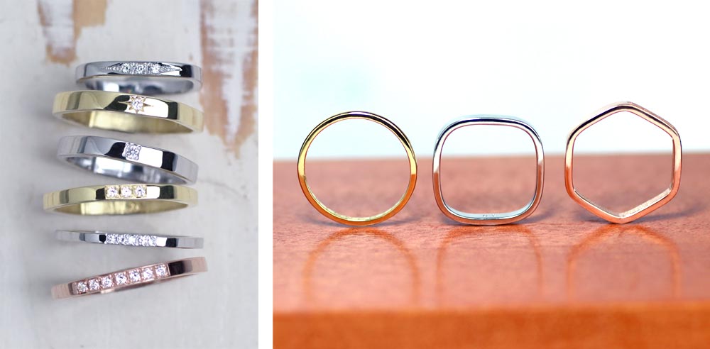 MAKIで結婚指輪を作る方法は「ワックス製法」と「彫金製法」を選んで作ることができますが、指輪本体の形が多角形になっている指輪はワックスでは作ることが難しい形で、金属を曲げて作る彫金製作でのみ製作が可能です。