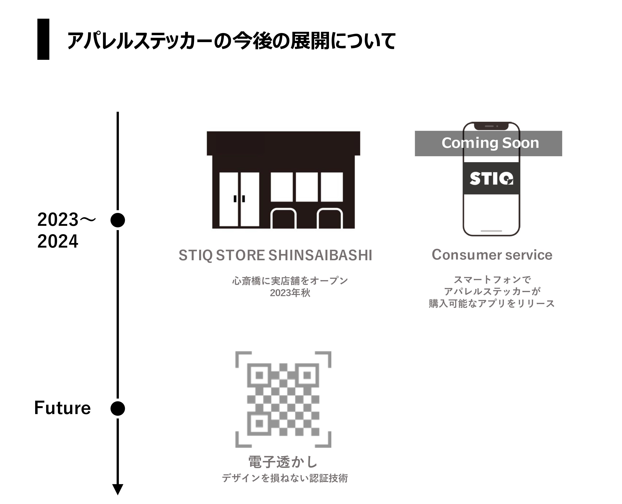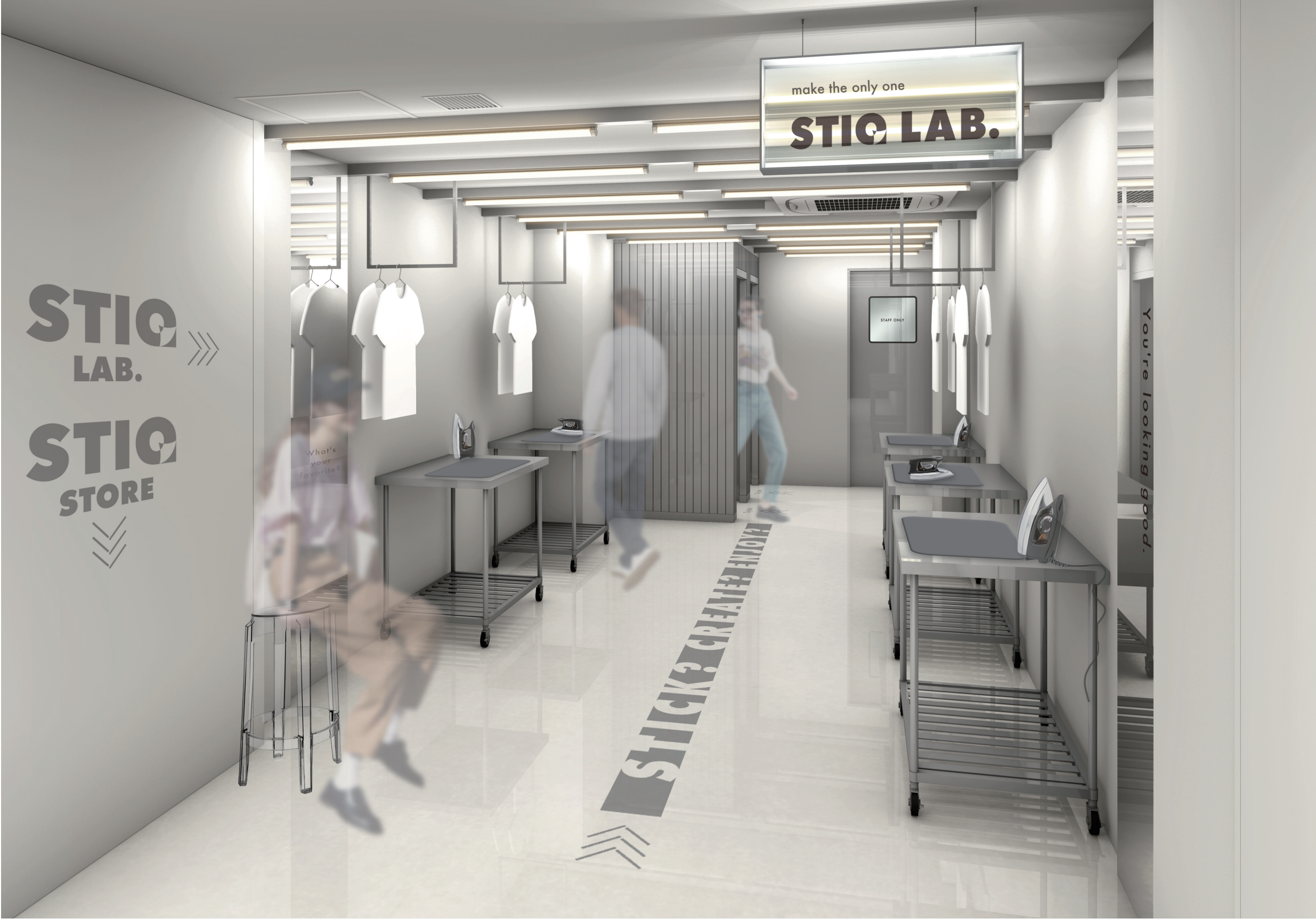 アパレルステッカー®は独自開発した伸縮性や耐水性のあるタックシールで、綿、ポリエステル、ジーンズ生地など様々な布製品に使えるだけでなく、帽子など曲面のある場所、ポケットの内側などにも貼り付け可能です。貼り付け方法もアイロンを2回使うだけ。好きなデザインを、好きな位置に貼付けられる「体験」と「感動」を最短1分で提供します。当製品を使ったこのサービスを「STIQ」と名付け、スマートフォンアプリでの提供に合わせて、ステッカーの購入から貼り付け体験までできる実店舗を関西の旗艦店「STIQ STORE SHINSAIBASHI」としてこのたびオープンします。当店では、アパレルステッカー®や無地Tシャツを販売するほか、2階では試着、アイロンで購入商品を貼り付けることがご体験いただけます。