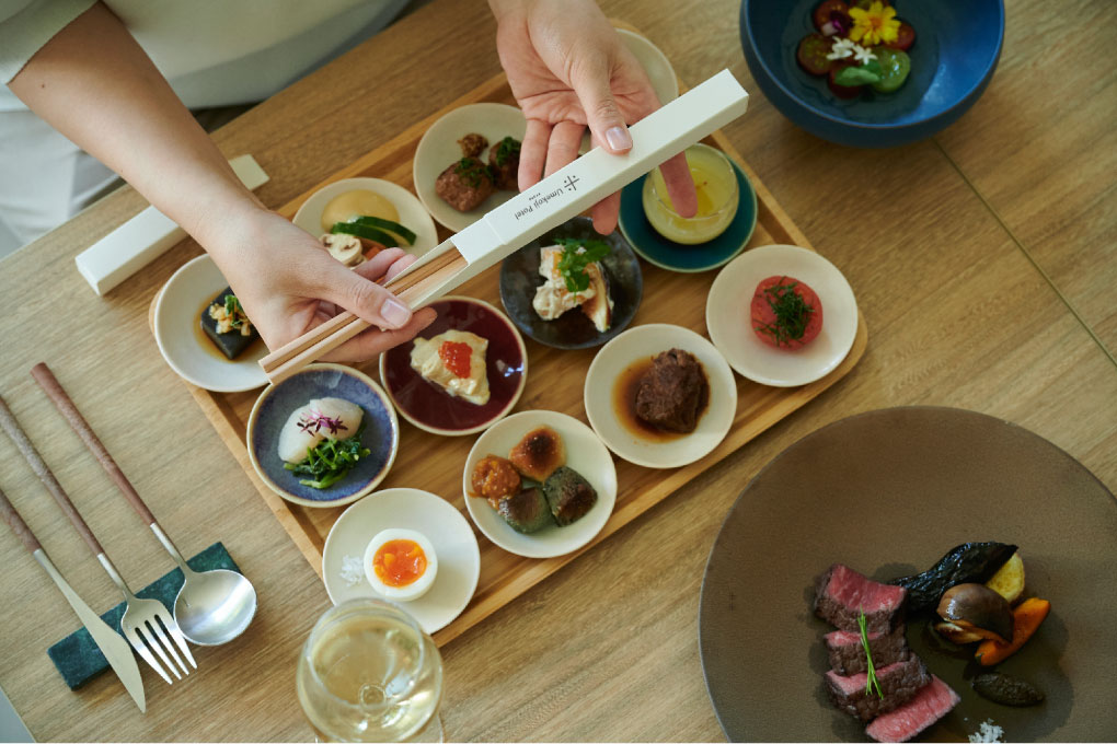 また、お皿だけでなくお箸にもこだわり、「お箸で旅する京都」のお題に沿って、軽やかで香りも良い北山杉のお箸でお料理を食べ進めていただきます。ひとつひとつ職人が手作りで作るため、手仕事のあたたかみを感じる逸品。こちらの箱に入ったPotelオリジナルのお箸はお食事のあと、ご自身でお持ち帰りいただきます。こちらはサスティナビリティの観点からMY箸としてご自宅に戻られてからも引き続きご利用ください。