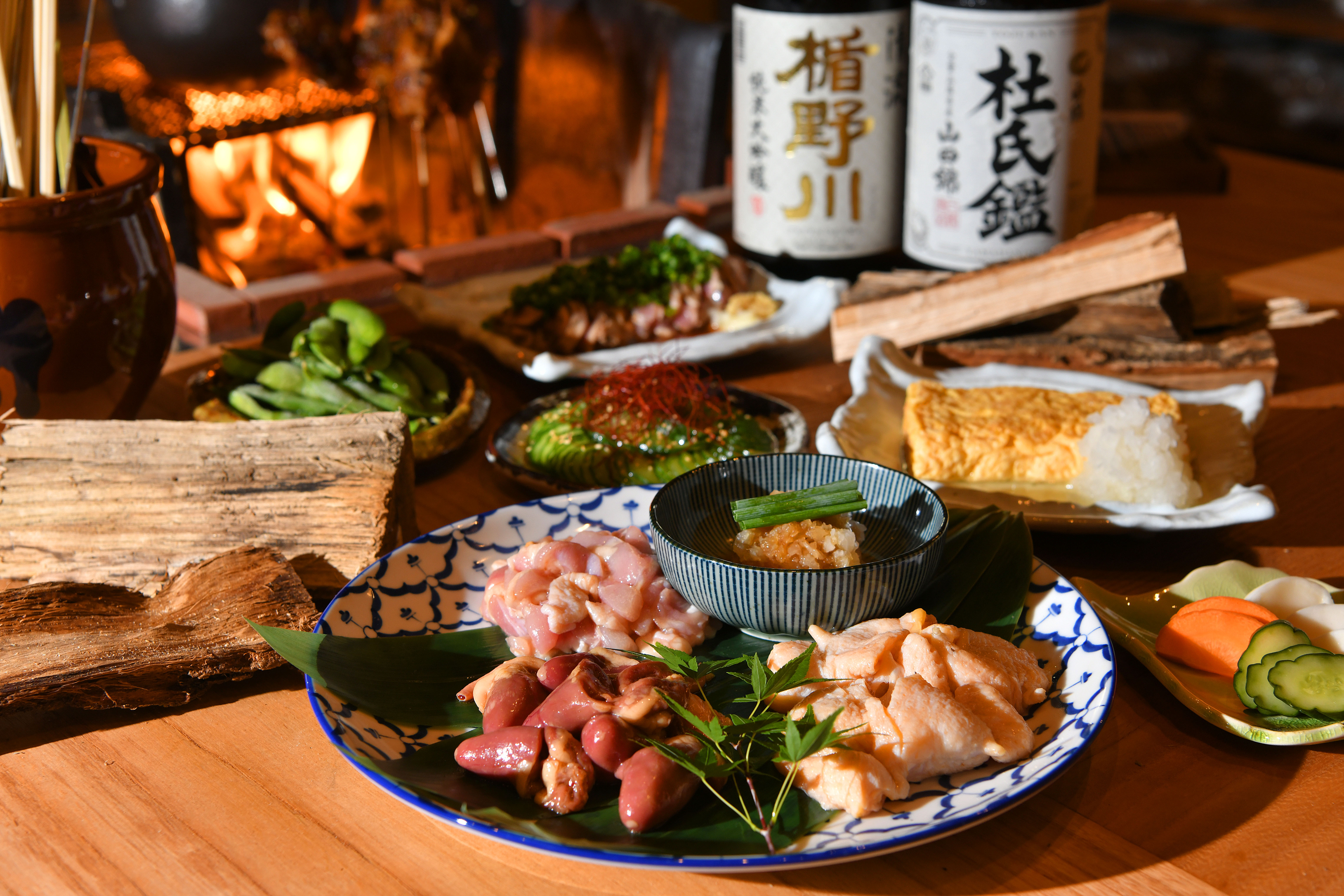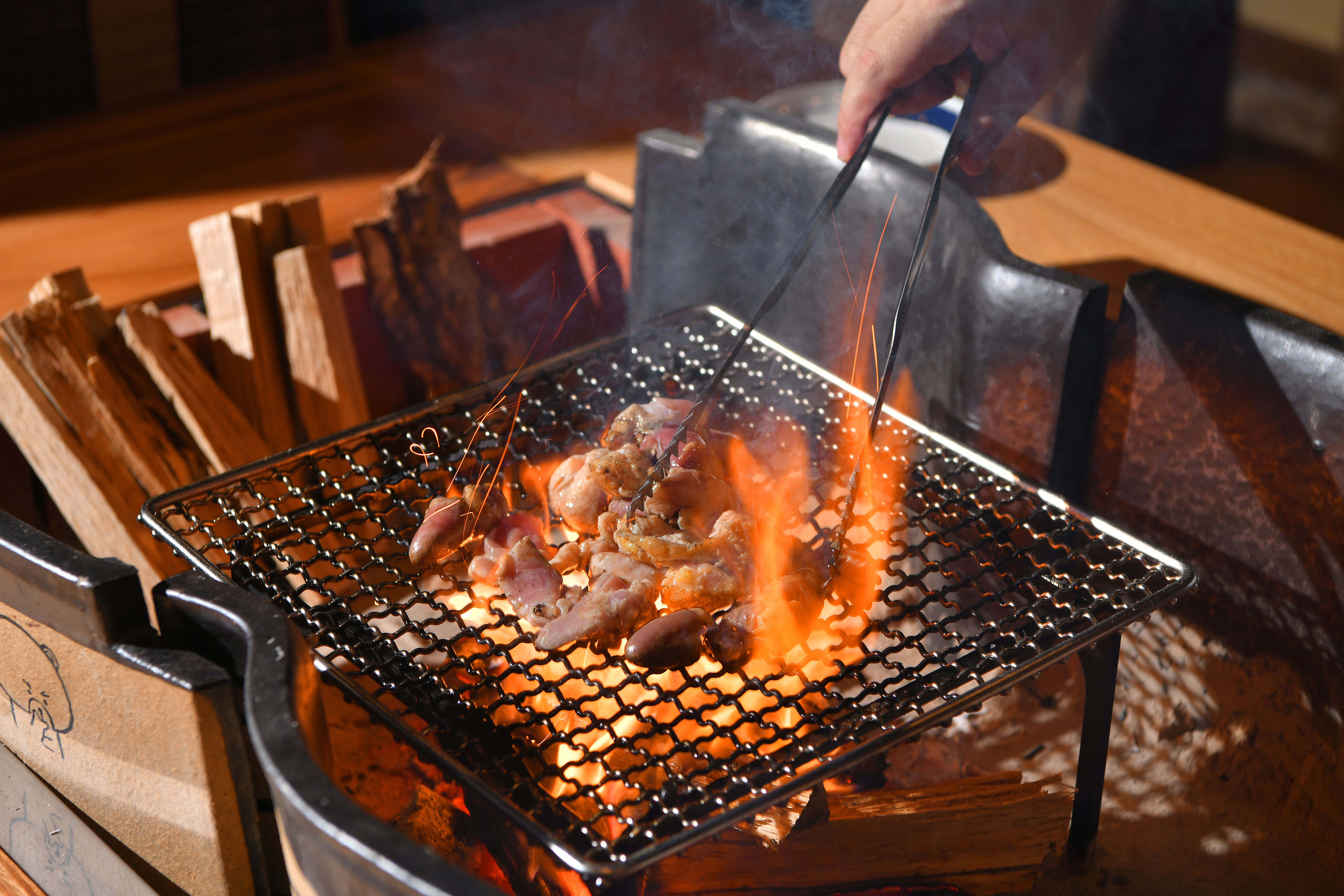 まずは、鶏の使い分けです。鶏は種類や季節によって、柔らかさ、歯応え、旨み、あっさり、しっとり、コリコリなどなど様々な特徴 があるので、部位によって鶏を使い分け、その鶏を最大限に活かす料理で提供致します。 次に、薪と炭を組み合わせたハイブリッドな焼き方です。メインとする火力は薪。薪の香りと鶏肉は相性が抜群で、その最高火 力で表面を燻し焼きにすることで、薪の芳醇な香りをまとわせることができます。薪の香りと、炭の程よい遠赤外線で焼き上げます。