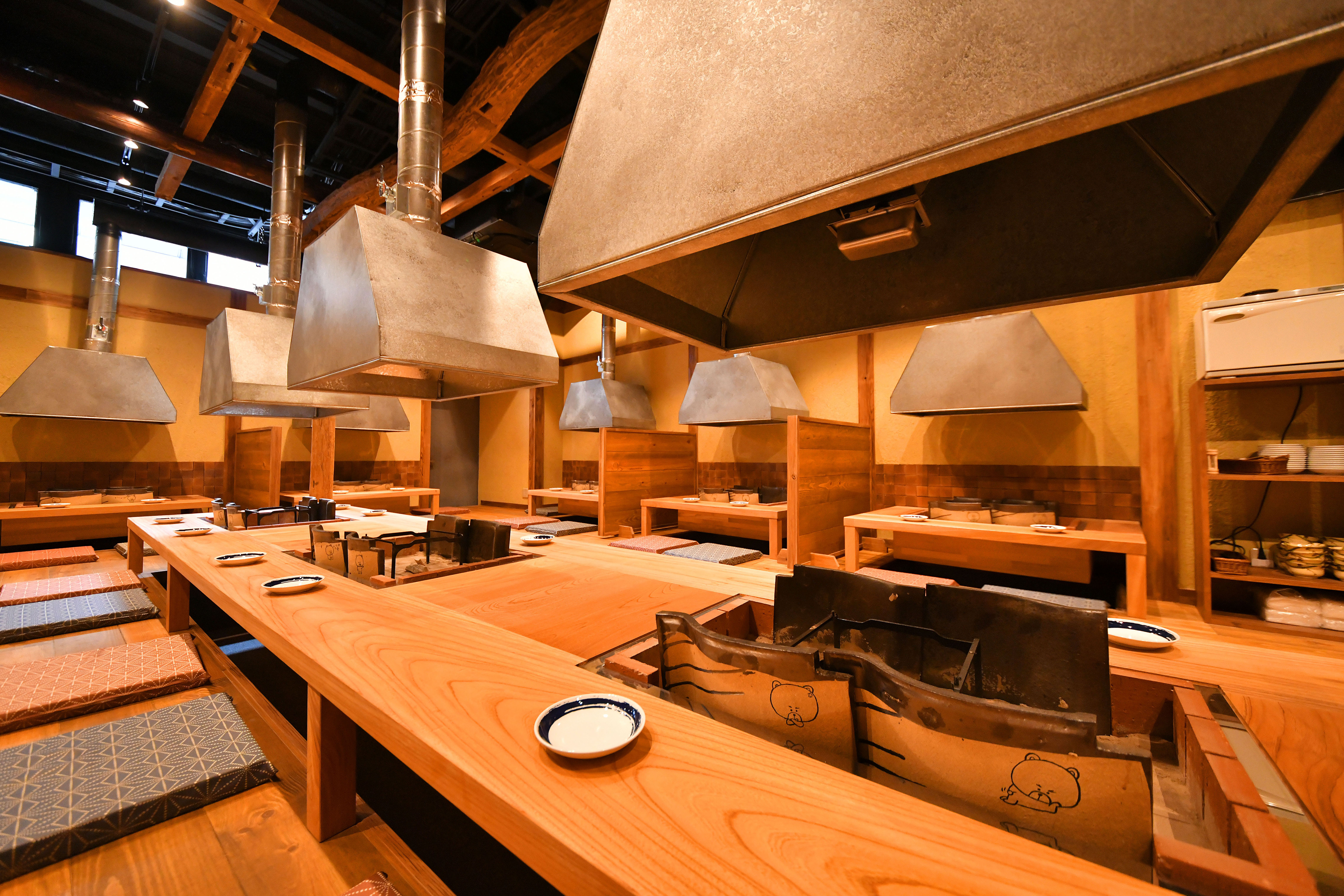 大阪のど真ん中にありながら、中に入るとメインキャラクターの「くーま君」がお出迎え。旅や日々の仕事の疲れを癒す店内は、 靴を脱いで頂き、全卓に設置した特注の「熊の囲炉裏」を仲間で囲み、ゆっくりくつろぎながら様々な鳥焼を堪能できます。