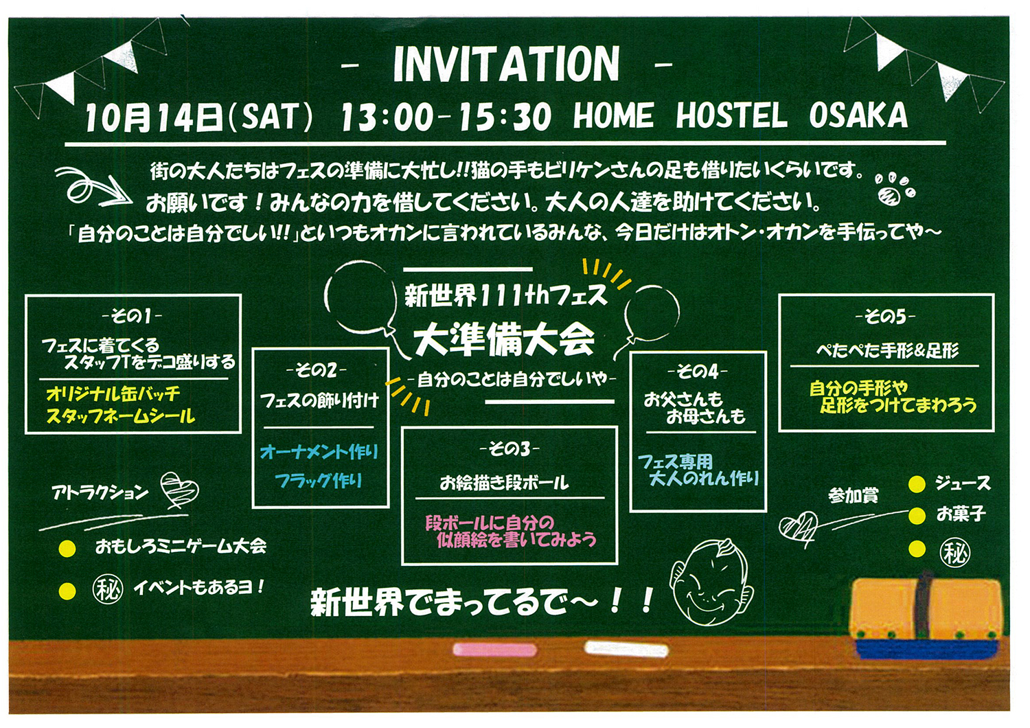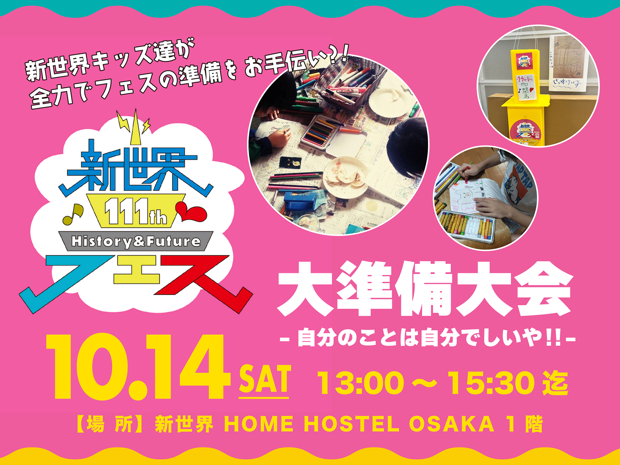 今年で111周年を迎えた「新世界」では、111年分の歴史と今そして輝く未来を体感してもらえる多くの人に"今"の新世界を満喫し、2025年の大阪・関西万博その未来の発展に向かうため、2023年11月3日・4日に開催される『新世界111thフェス~ナニワ区 EXPO~』の開催準備イベントとして、新世界キッズ達が全力でフェスの準備をお手伝いする『新世界111thフェス大準備大会-自分のことは自分でしいや!!-』を、新世界 HOME HOSTEL OSAKAにて2023年10月14日(土)に開催いたします。
