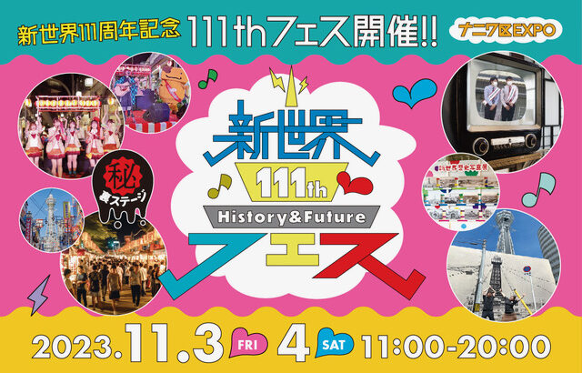 大阪・新世界が誕生して111年!それを記念して「新世界111thフェス」を行います。歴史・お笑い・音楽・アート・グルメなどてんこ盛り!「新世界音楽博覧会」略して音博も同時開催!新世界111thフェス & 音博をお楽しみください!2023.11.3(金・祝)/4(土)通天閣のおひざもと新世界にて開催決定!