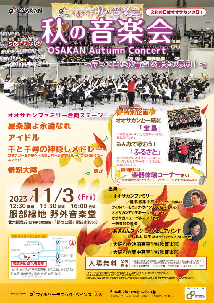 毎回約2000名を超すお客様にお越しいただいていたオオサカンの”あきおん”が3年ぶりに復活!!今年は初の試みとして府内中学生による「あきおんスペシャルジュニアバンド」を結成!一期一会の音を奏でます♪続く府立高等学校吹奏楽部による個性豊かな演奏の後は、オオサカンファミリーステージ!世界的ヒット曲YOASOBI『アイドル』、根強い人気のジブリ映画『千と千尋の神隠し』など世代を超えてお楽しみいただける曲目を揃えました。そして総勢200名以上による圧巻の『宝島』、秋の空に響く『ふるさと』の大合唱…文化の日はオオサカンの日♪演奏のみならず楽器体験コーナーもあり、吹奏楽に浸れる一日をお楽しみください!