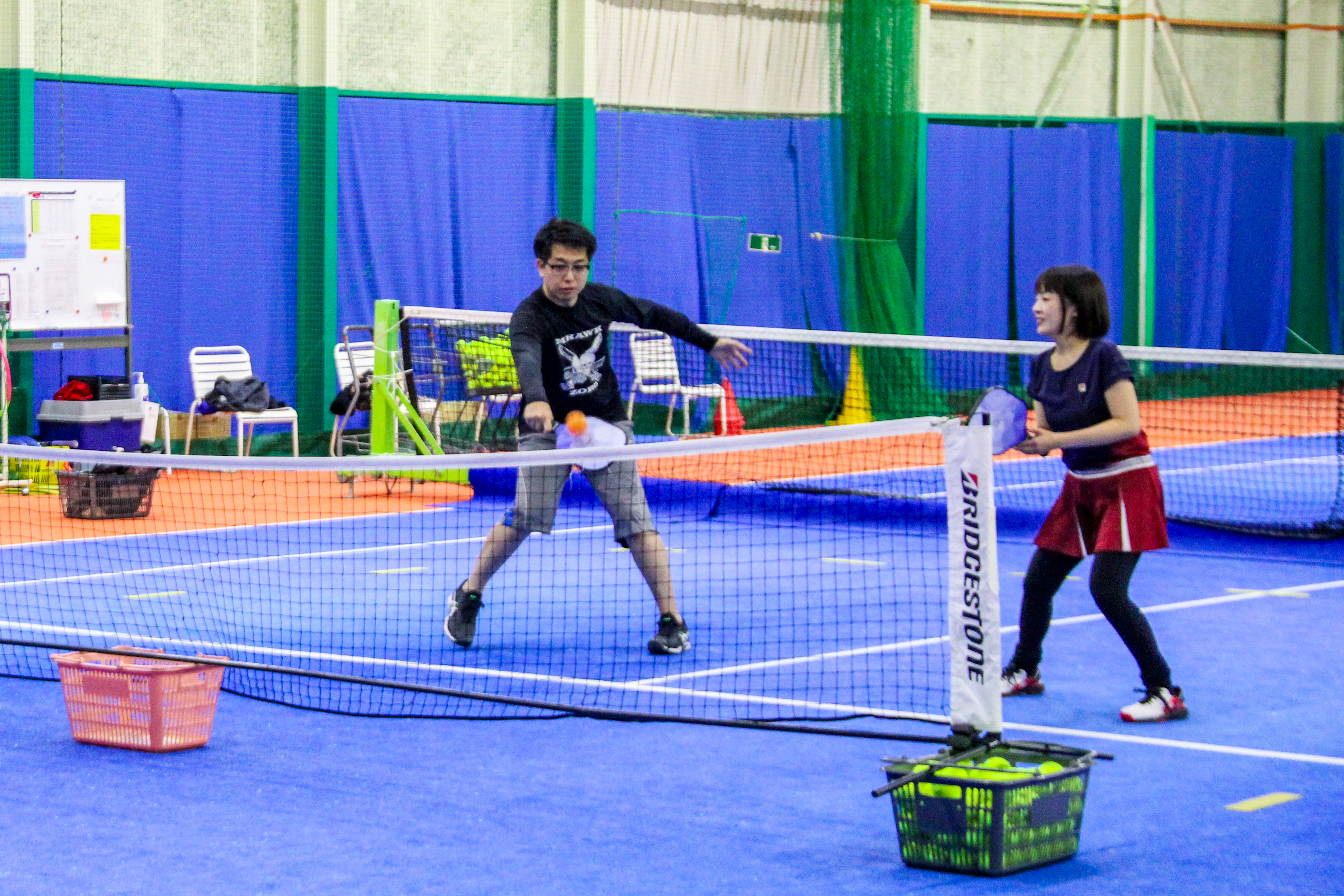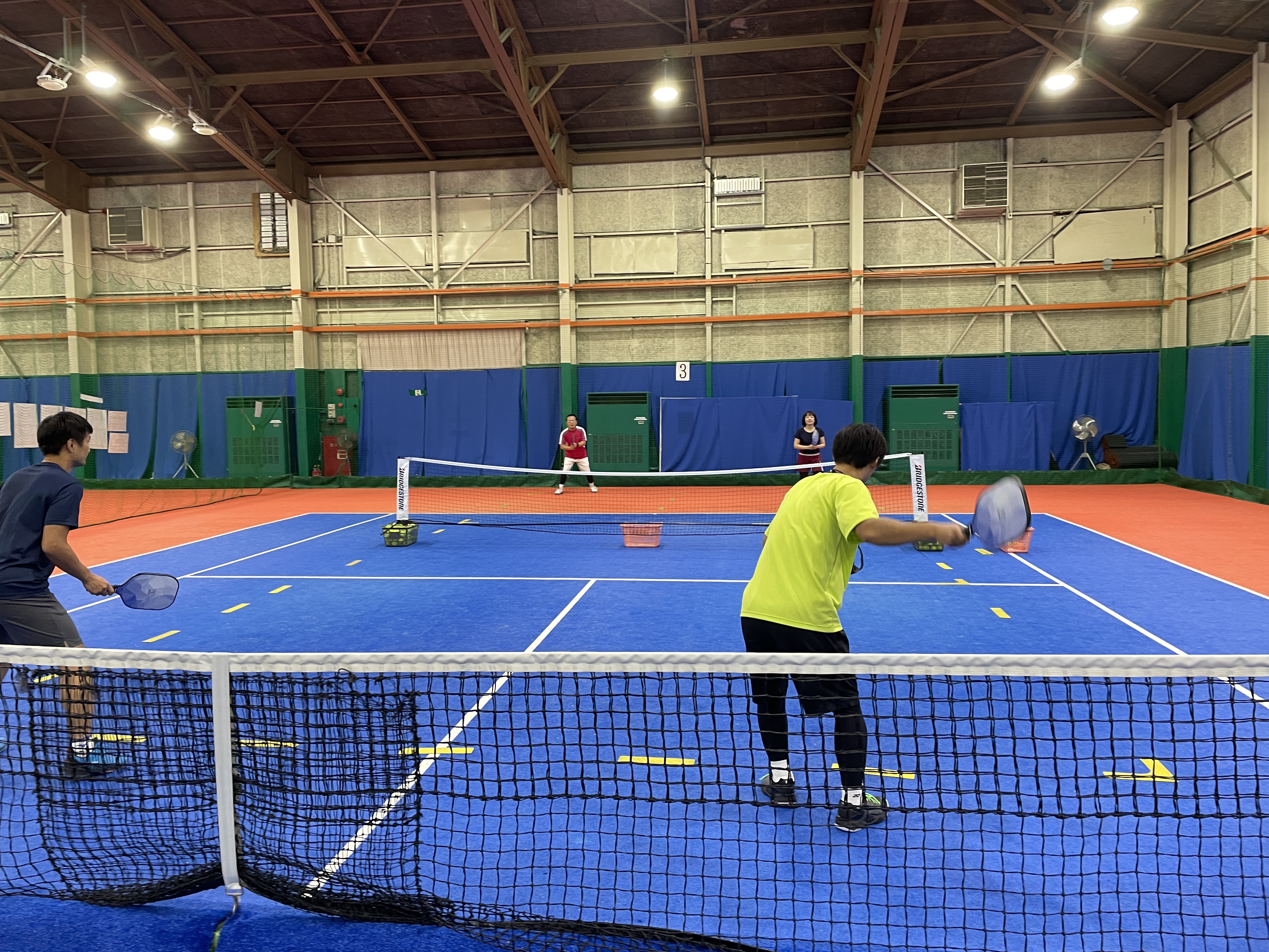 ピックルボールとはバドミントンコートと同じ広さのコートで板状のパドルを使い、穴あきのプラスティック製のボールを打ち合うスポーツです。穴あきのボールが風の抵抗を受けボールのスピードが緩まるため、少しの練習でラリーが楽しめます。テニス経験者の場合は15分ほどですぐにゲームが出来るようになります。