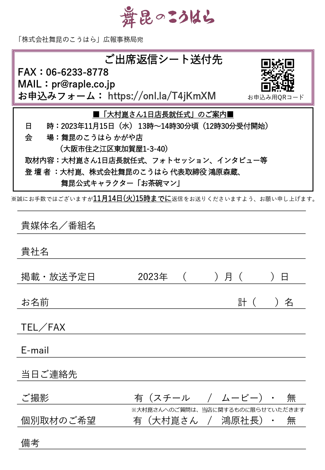 大阪の昆布専門店「舞昆のこうはら」(本社:大阪市住之江区東加賀屋1-3-40、代表取締役社長:鴻原森蔵)は2023年11月15日(水)の「昆布の日」、俳優でタレントの大村崑さんに「舞昆のこうはら かがや店」の1日店長を務めていただきます。当日は店長就任式を行い、大村さんがお客様をお迎えする様子をご取材いただけます。