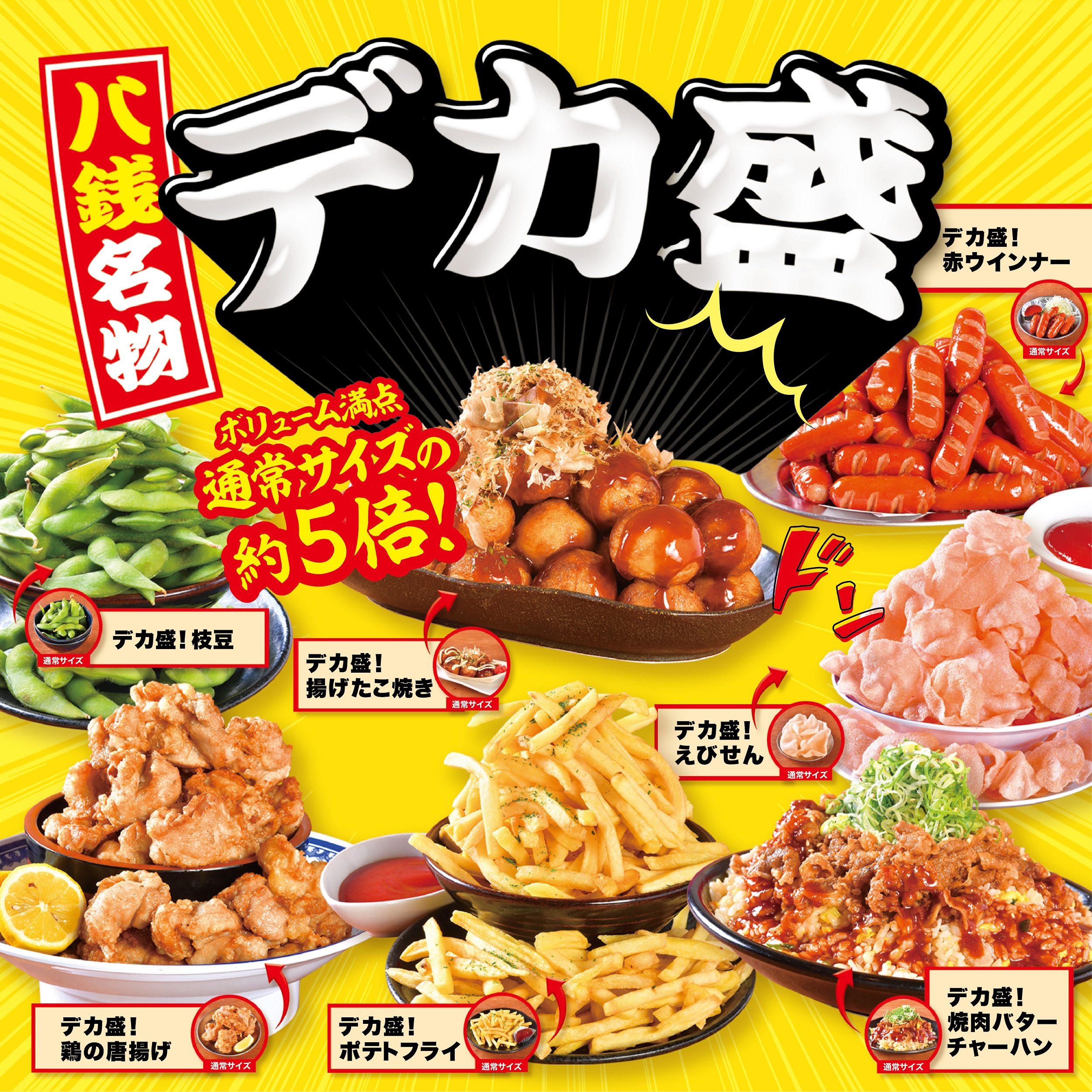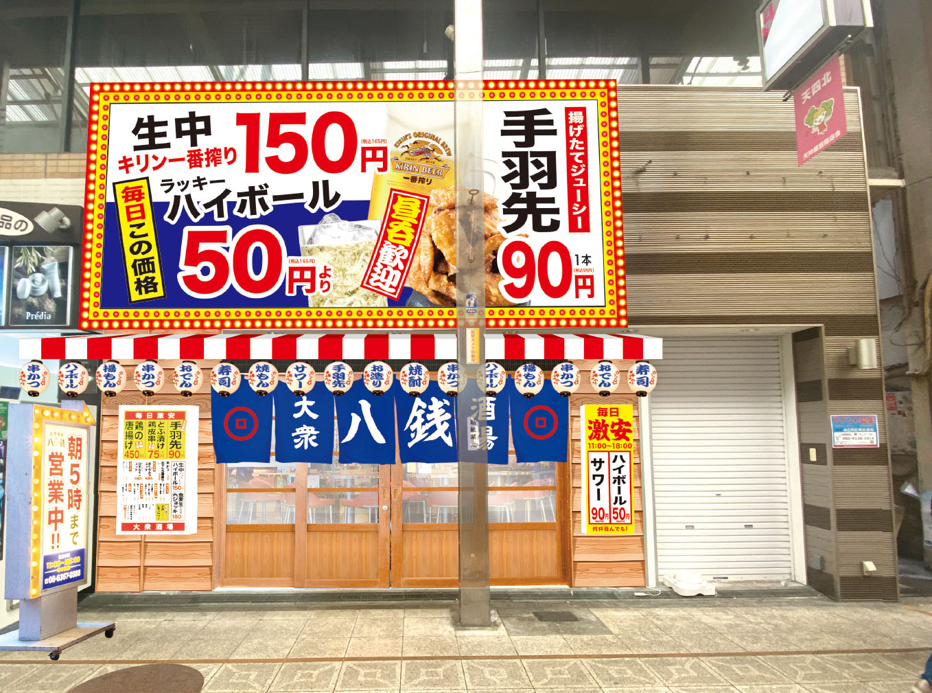 大阪を代表する繁華街 梅田堂山でひと際派手な『大衆酒場 八銭』は、一品50円~・生ビール150円・ハイボール50円の限界価格で365日ご提供しており、OPENからわずか1年で連日超満員の居酒屋へと成長致しました。
