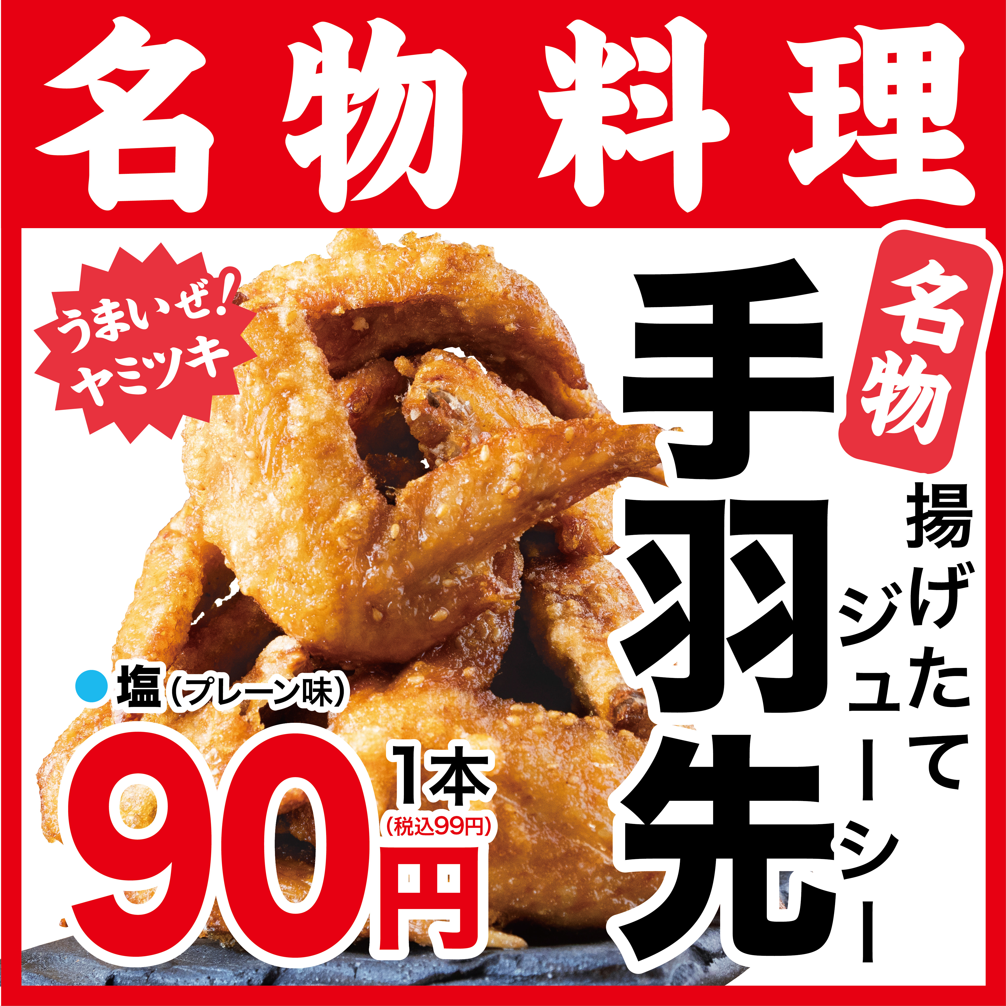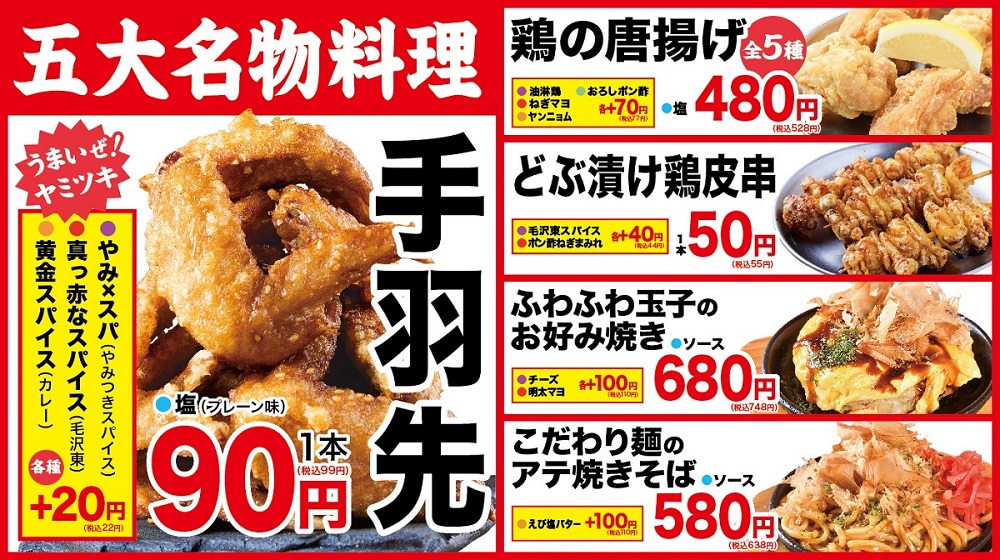 ただ安いだけでなく、味にもこだわりがあるのが人気の秘訣。当店の手羽先は注文率90%を超える大人気メニュー。カリっとジューシーで食べ応え抜群の手羽先は、選べる4種類のスパイスをご用意。一度食べるとやみつきの味で、お酒との相性は抜群。その他、今回初めて発売されるデカ盛りメニューは唐揚げや焼肉バターチャーハンなど計7種類。通常サイズの約5倍でありながらほとんどのメニューが1,000円代とコスパも申し分なし。気の知れた仲間との楽しい飲み会に是非ご注文頂きたいメニューです。