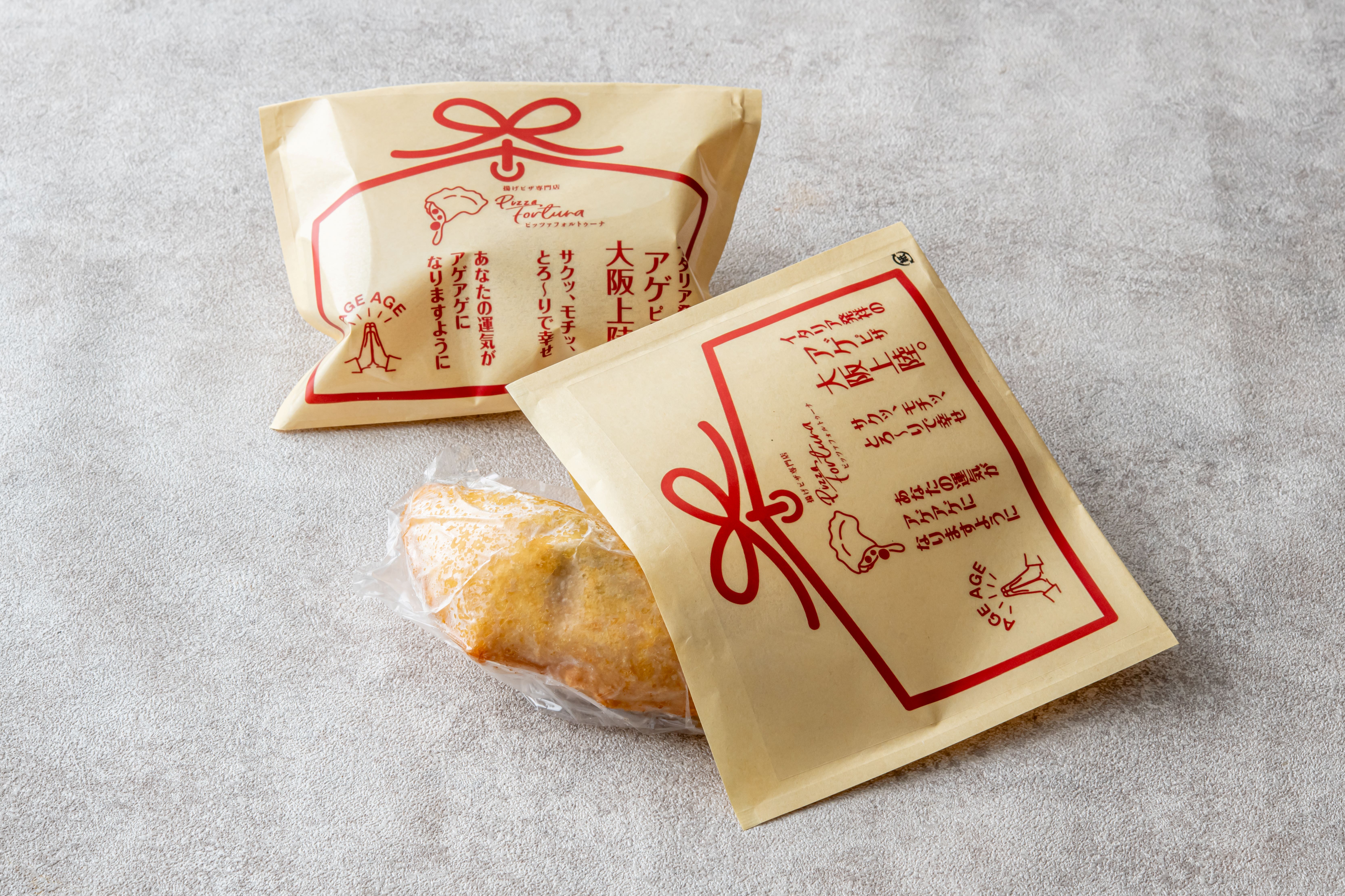 〝美味しい幸せを届けたい〟というオーナー夫妻の想いと「揚げピザを食べて、運気アゲアゲになりますように」というメッセージが込められた、絵馬をモチーフにした揚げピザのパッケージになっています。