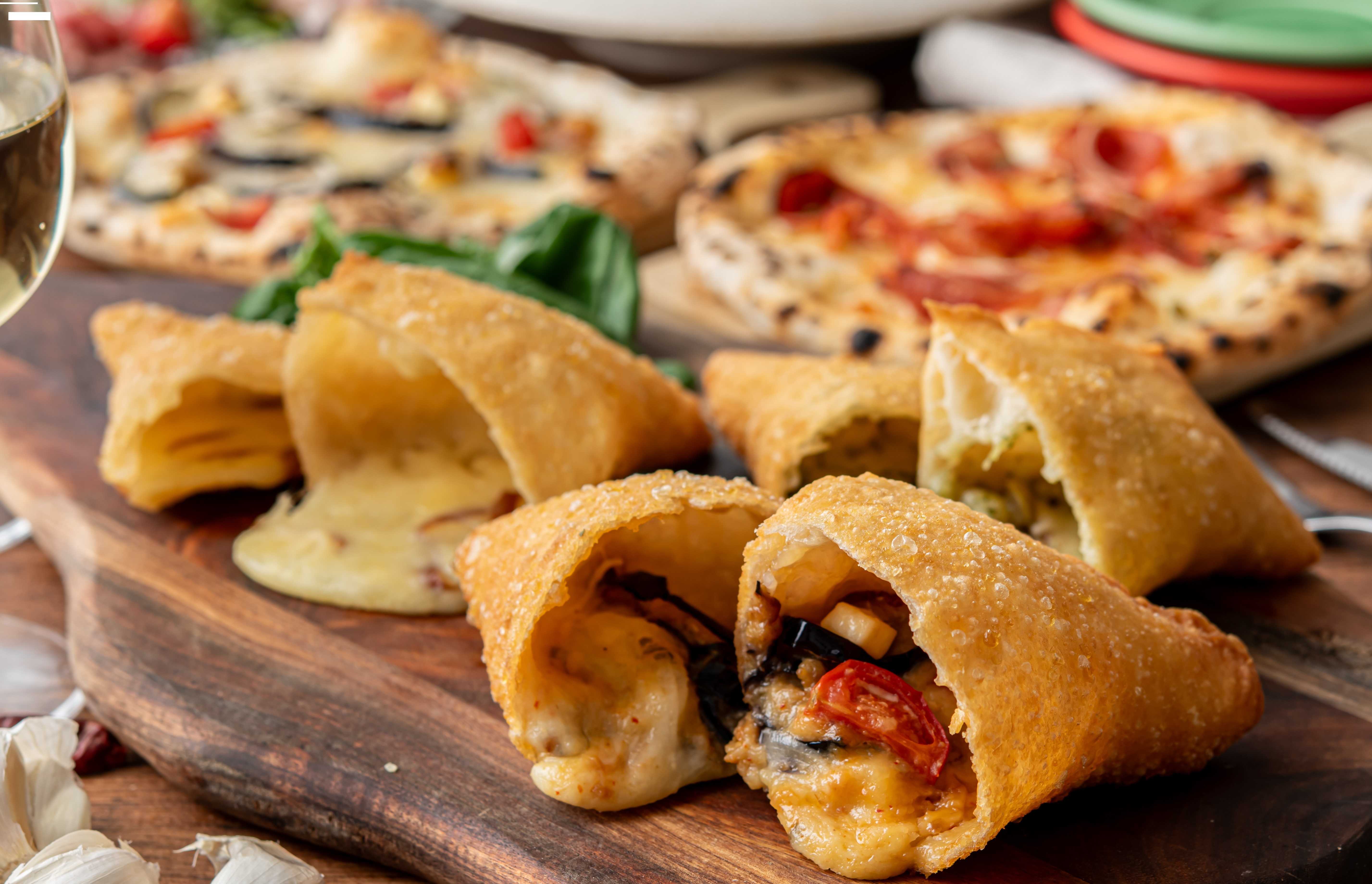 「揚げピザ」はヘルシーな米油で揚げて表面はカリッ中はもっちりとした食感で、ひと口かじるととろりと伸びるチーズや具材など、フレッシュな素材が味わえるPIZZA FORTUNA(ピッツァフォルトゥーナ)自慢のピザで、テイクアウトでも人気の一品です。