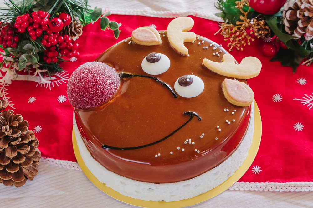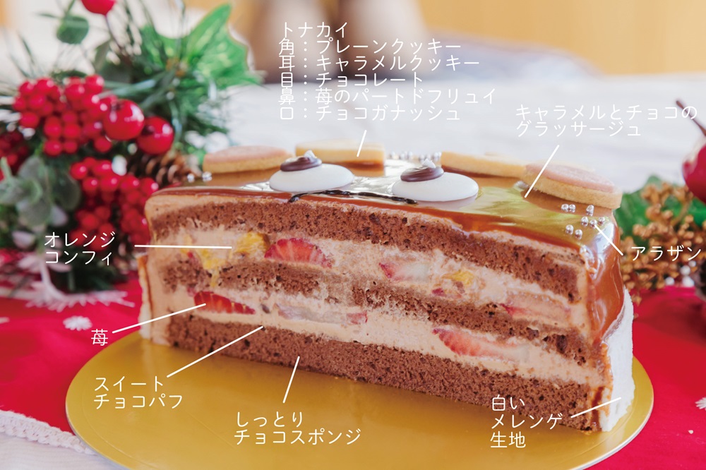 お子さまが喜ぶこと間違いなしの、キュートなトナカイケーキ。中はチョコスポンジにチョコクリーム苺、オレンジのコンフィをサンド。ツヤツヤのキャラメルとチョコレートのグラッサージュで仕上げ、大人も一緒に楽しめる、本格的な味わいに仕上げました。