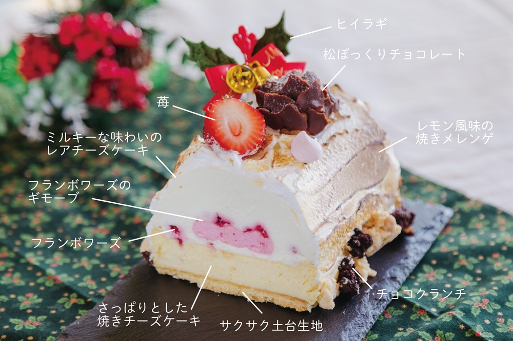 ミルキーでどっしりした味わいのレアチーズと、さくさく食感の生地を敷いた焼きチーズ。2種類のケーキが味わえるブッシュドノエルは、どこから食べても食感の変化をお楽しみいただけます。ぜひ、芳ばしい香りから味わってください。