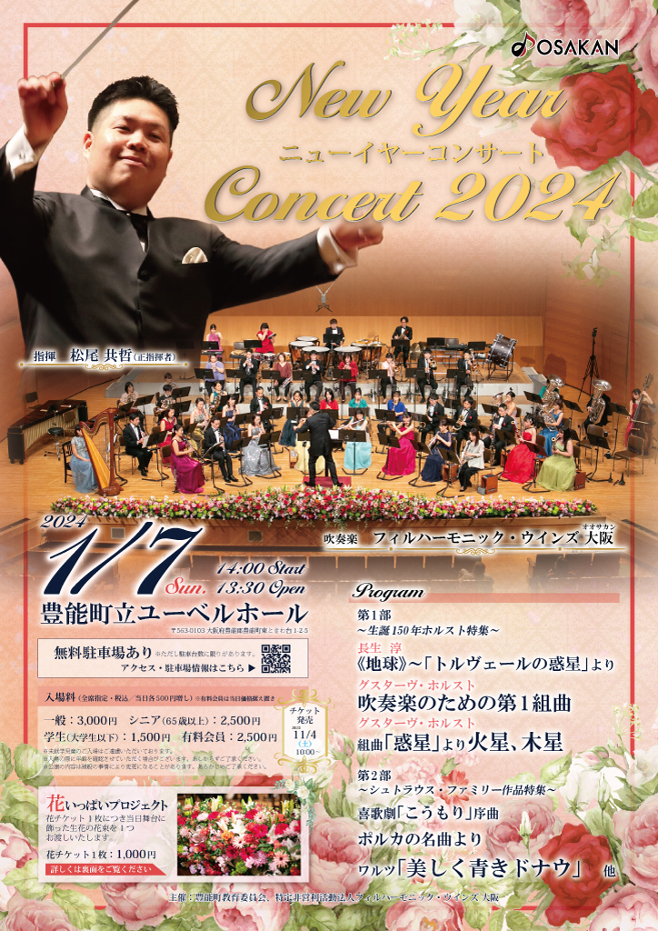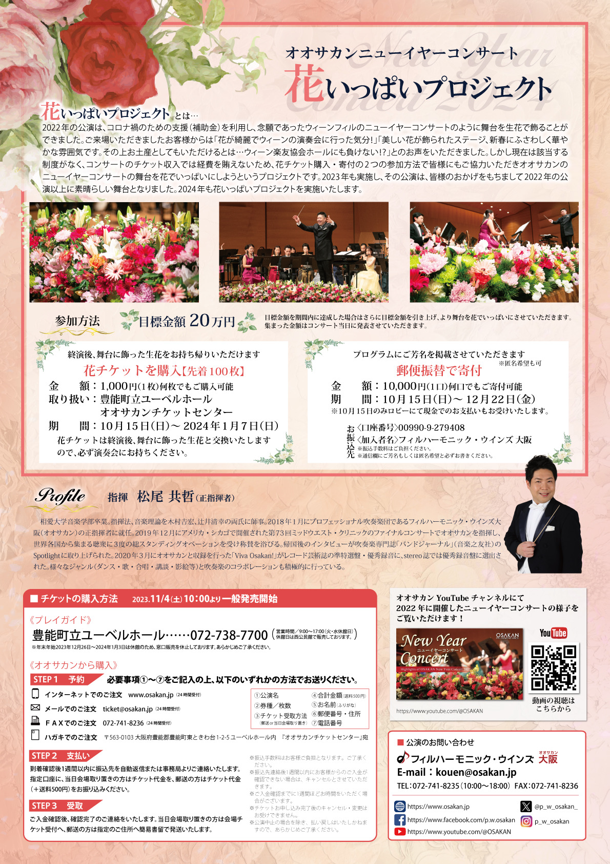 2022年の公演は、コロナ禍のための支援(補助金)を利用し、念願であったウィーンフィルのニューイヤーコンサートのように舞台を生花で飾ることができました。ご来場いただきましたお客様からは「花が綺麗でウィーンの演奏会に行った気分!」「美しい花が飾られたステージ、新春にふさわしく華やかな雰囲気です。その上お土産としてもいただけるとは…ウィーン楽友協会ホールにも負けない⁈」とのお声をいただきました。しかし現在は該当する制度がなく、コンサートのチケット収入では経費を賄えないため、花チケット購入・寄付の2つの参加方法で皆様にもご協力いただきオオサカンのニューイヤーコンサートの舞台を花でいっぱいにしようというプロジェクトです。2023年も実施し、その公演は、皆様のおかげをもちまして2022年の公演以上に素晴らしい舞台となりました。2024年も花いっぱいプロジェクトを実施いたします。