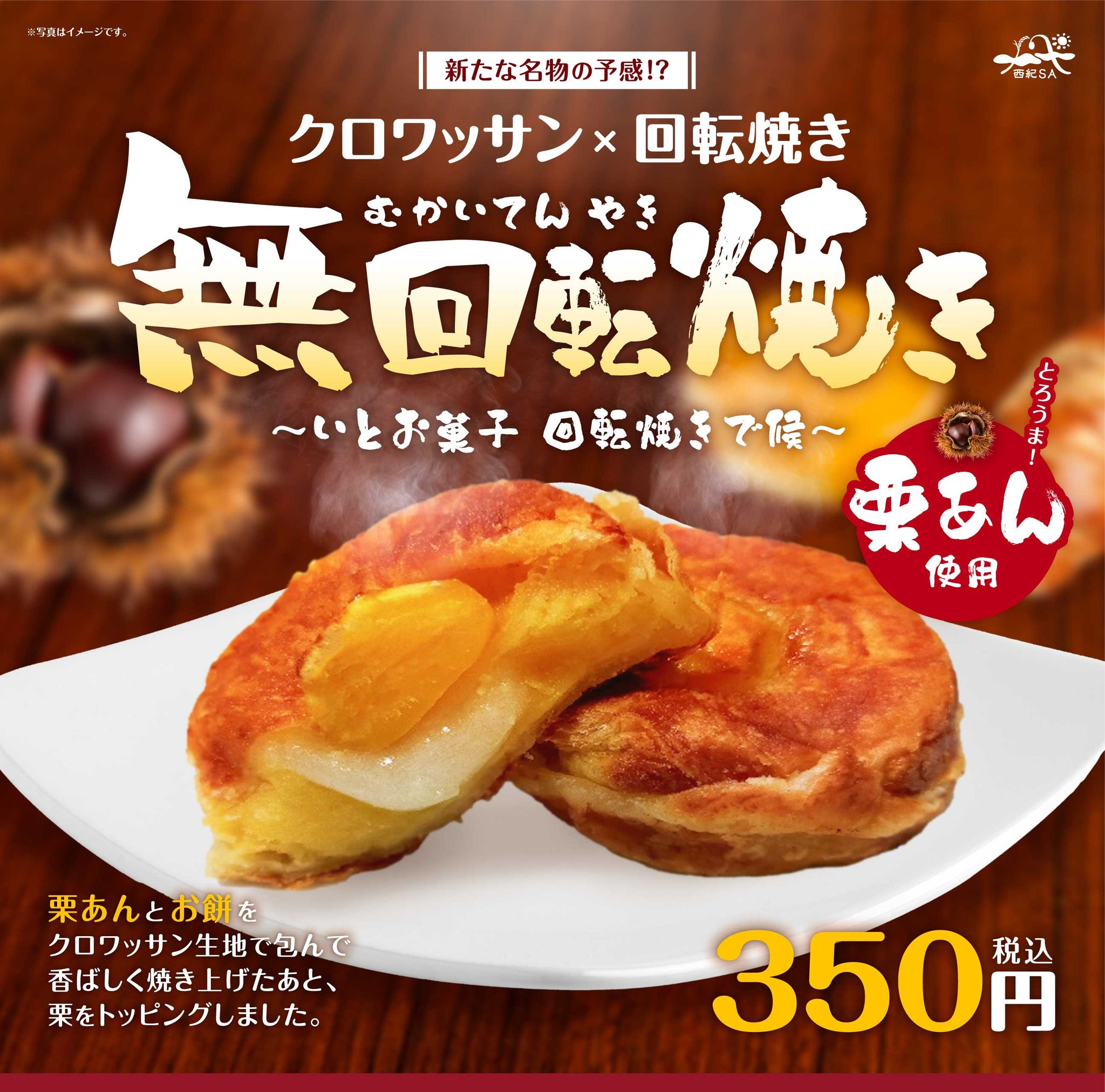 光明興業株式会社(大阪市中央区難波4-2-1 難波御堂筋ビルディング11 階)が運営する西紀(にしき)サービスエリア下り線は12月19日(火)より、「無回転焼き®」と題したスイーツ(350円)を販売します。上り線で提供する無回転焼き®と対になる商品で、下り線では栗あんと栗の甘露煮、お餅をクロワッサン生地で包んだものになっています。