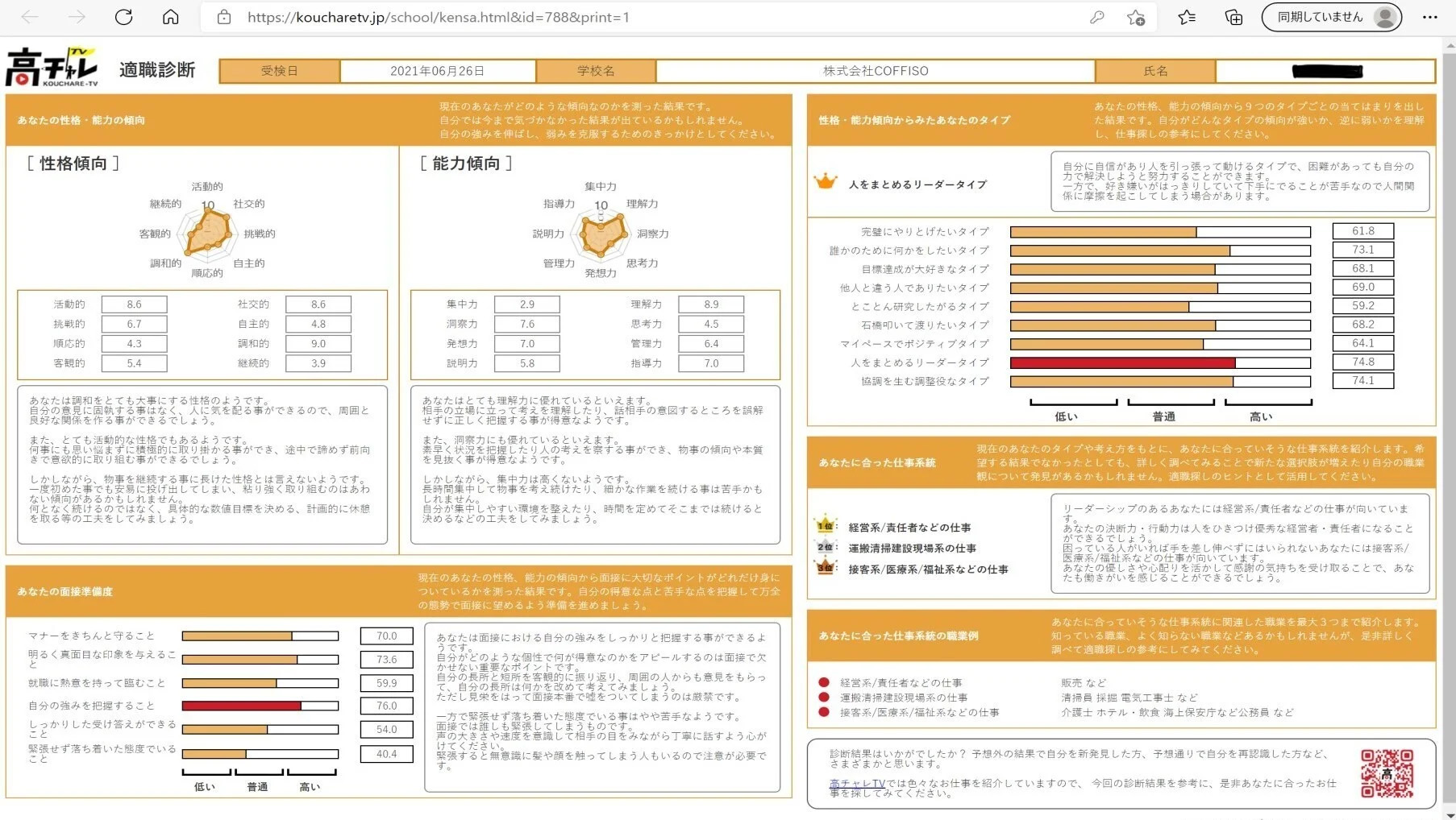 生徒たちも自分の人格や志向性が言語化されるのを興味津々に見ており、自己認識の重要性とそれに紐づいた職業の検討を行うべきことを改めて認識させられました。ありがとうございます。