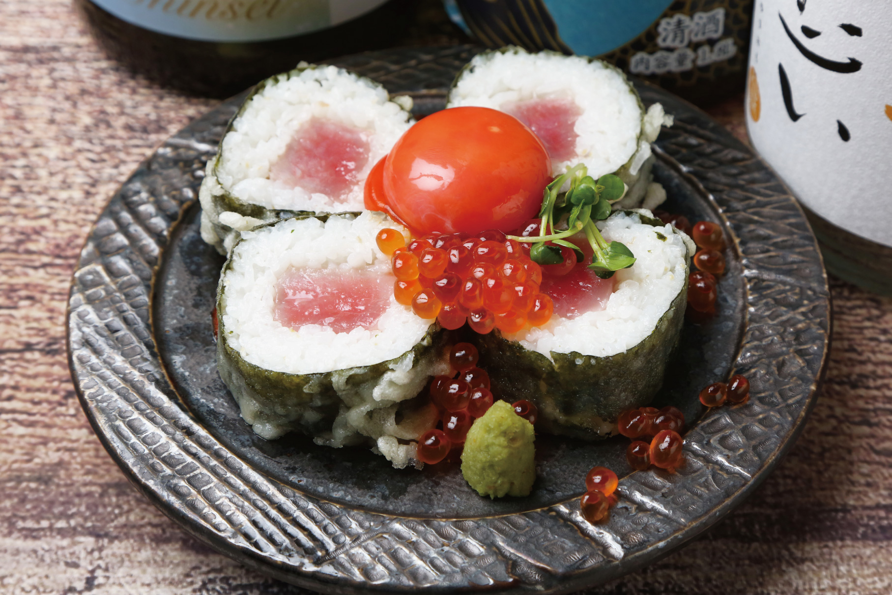 看板メニューは、「神聖」の酒粕と湯葉、豆乳をふんだんに使用することでとろみのある出汁に仕上げた、寒い冬にピッタリの「神聖酒粕 京湯葉鍋」(1,639円)です。酒粕は肌荒れや肥満抑制に効果があるとされる「レジスタントプロテイン」を、湯葉はたんぱく質を多く含むため、おいしく美容にもアプローチできる女性にもおすすめのメニューです。チーズをのせて焼き上げた「京湯葉ピザ」(869円)や「京湯葉とチーズの包揚げ」(869円)などの湯葉メニュー、「酒粕フォンダンショコラ」(759円)「酒粕ブリュレ」(649円)など酒粕スイーツもご用意。このほか、「生マグロといくらの太巻き天ぷら」(1,309円)や「焼き白ネギ 金山寺味噌添え」(759円)、「手羽先唐揚げ柚子胡椒添え」(649円)など30種類以上のフードをそろえています。