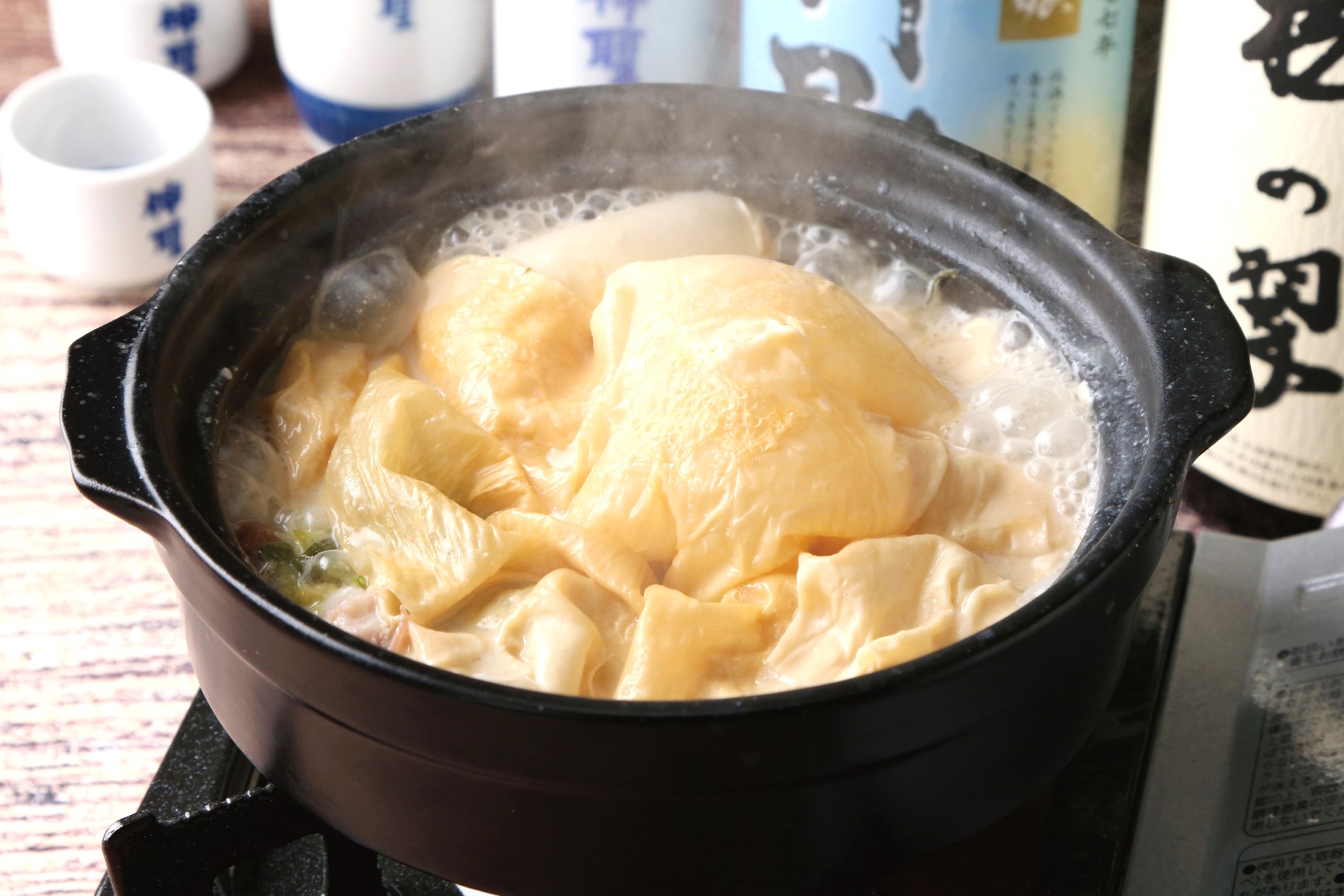 豆乳と「神聖」の酒粕を合わせたお出汁で、京都の老舗湯葉専門店の湯葉や京野菜、京都のもち豚をに煮込みました。