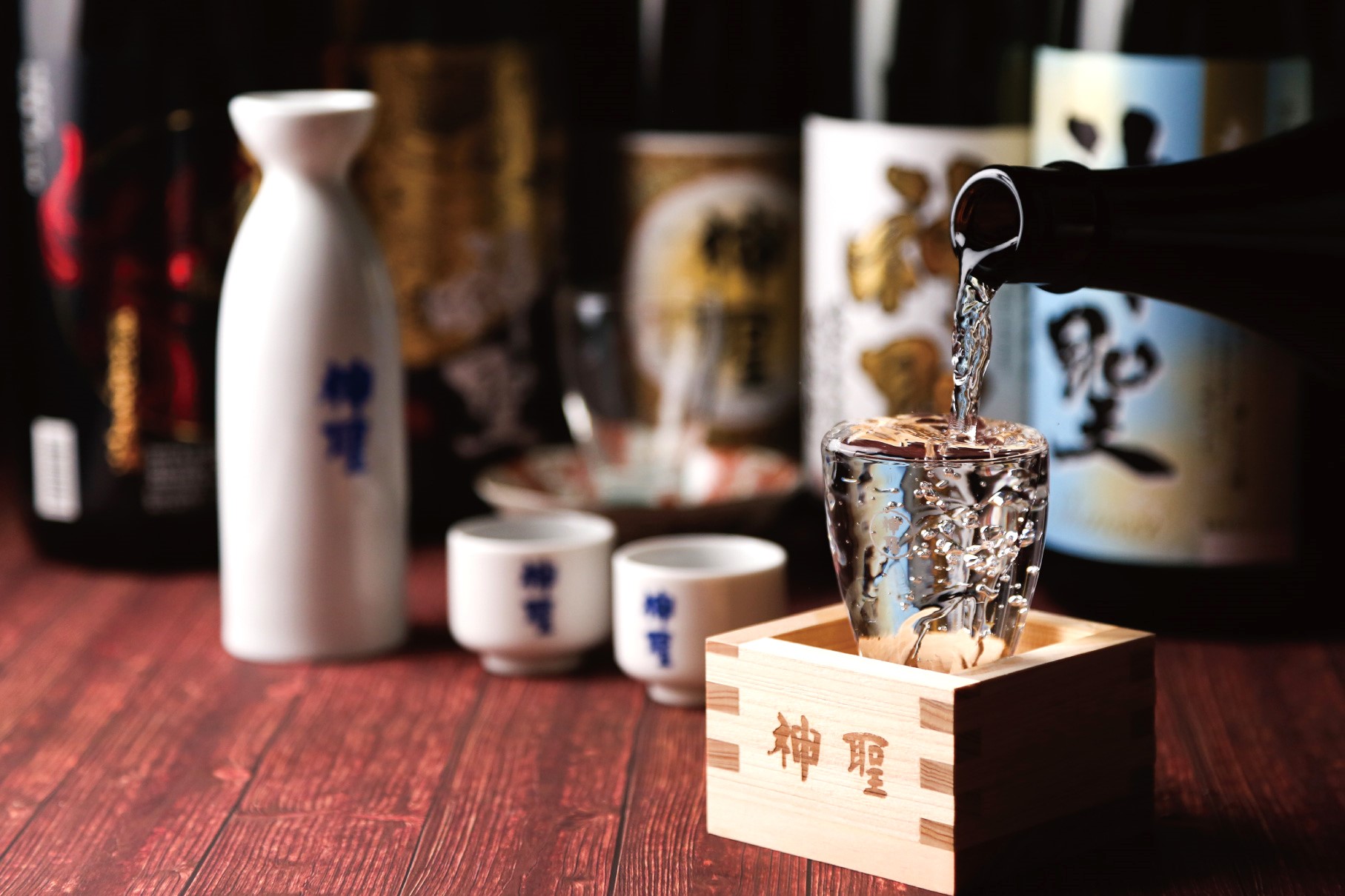 日本酒「神聖」は、京都府産の酒米「祝(いわい)」と京都酵母「京の恋」を使った「神聖 祝 純米吟醸」(869円)や軽やかな飲み口の「純米 かぐや姫」(759円)など13種類をフルラインナップ。サワーやソフトドリンクも各種そろえています。