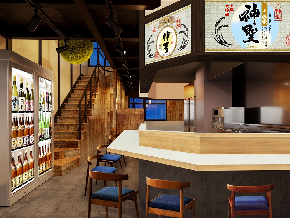 「日本酒と湯葉と海鮮 神聖酒場」は、日本酒「神聖」で有名な京都・伏見の老舗酒造「山本本家」がプロデュースする新業態です。伏見七名水の1つ「白菊水」で生まれた日本酒「神聖」の酒粕を使った料理や高知県つくも漁港から仲買を通さず直接仕入れた新鮮な海鮮料理、京都の老舗湯葉専門店の湯葉を使った料理などをご提供します。国内外から京都を訪れる観光客のほか、烏丸周辺で働いたり買い物したりする30代以上の女性がメインターゲットです。
