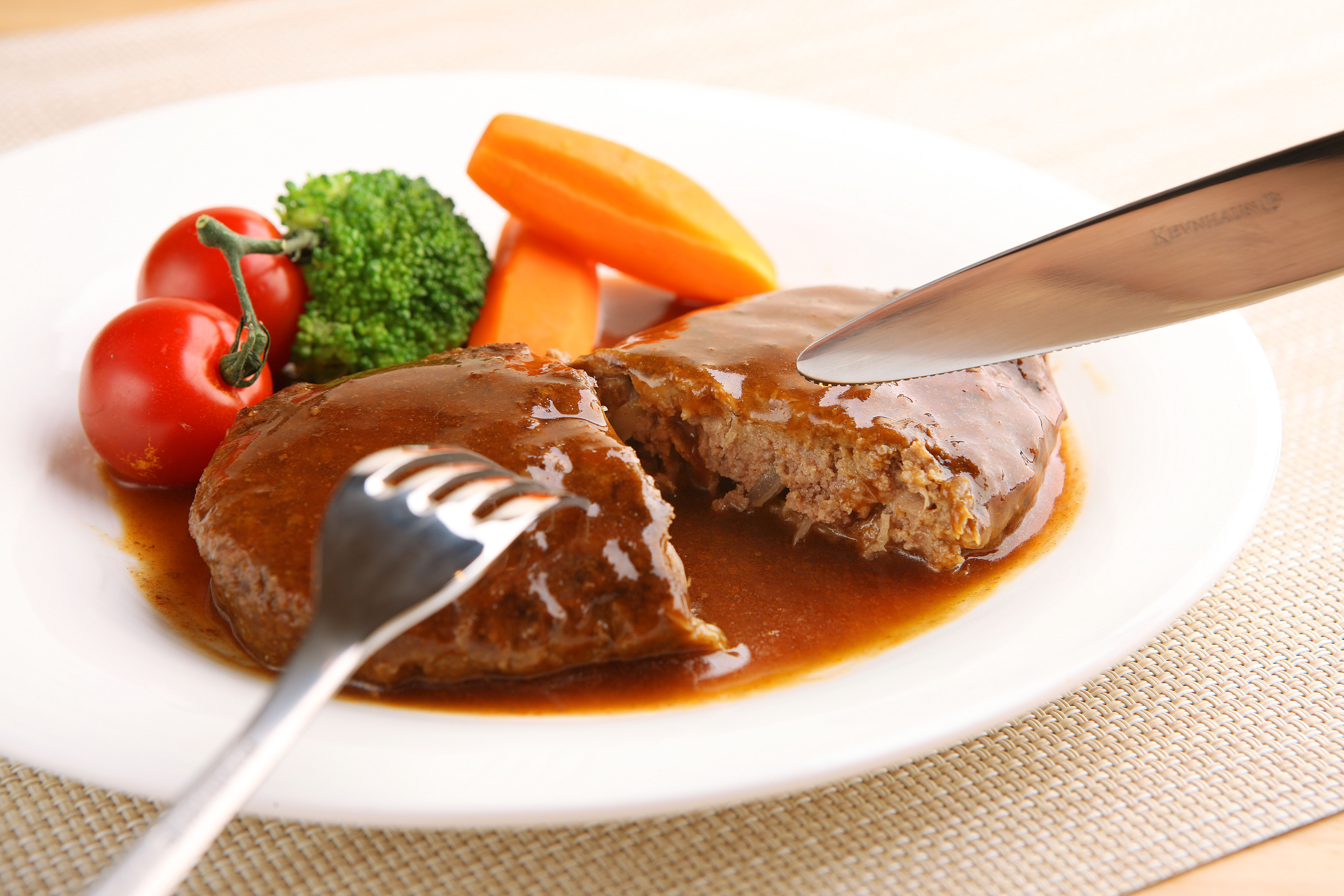 当店のハンバーグは、神戸牛・神戸豚・国産牛の合い挽き肉を使用。「粗びき」「普通びき」の挽き肉を使うことで2段階の食感が楽しめます。それに大量の淡路産のタマネギ(みじん切りにし、3分の1の量になるまで炒めて甘みを引き出します)と、パン粉+2種の合計3種のつなぎを合わせ、保水力を高めて鉄板でじっくり芯まで加熱。赤ワインのアルコールを飛ばして作ったオリジナルのデミグラスソースで煮込み、すぐに粗熱を取ってソースがしみ込むよう真空包装します。今回の改良では上記3種のつなぎの配合を変え、舌触りがよりなめらかに。ひき肉がバラけず誤飲・誤嚥を防ぎます、小さなお子様からご高齢の方までさらに食べやすい安全なハンバーグへ進化しました。