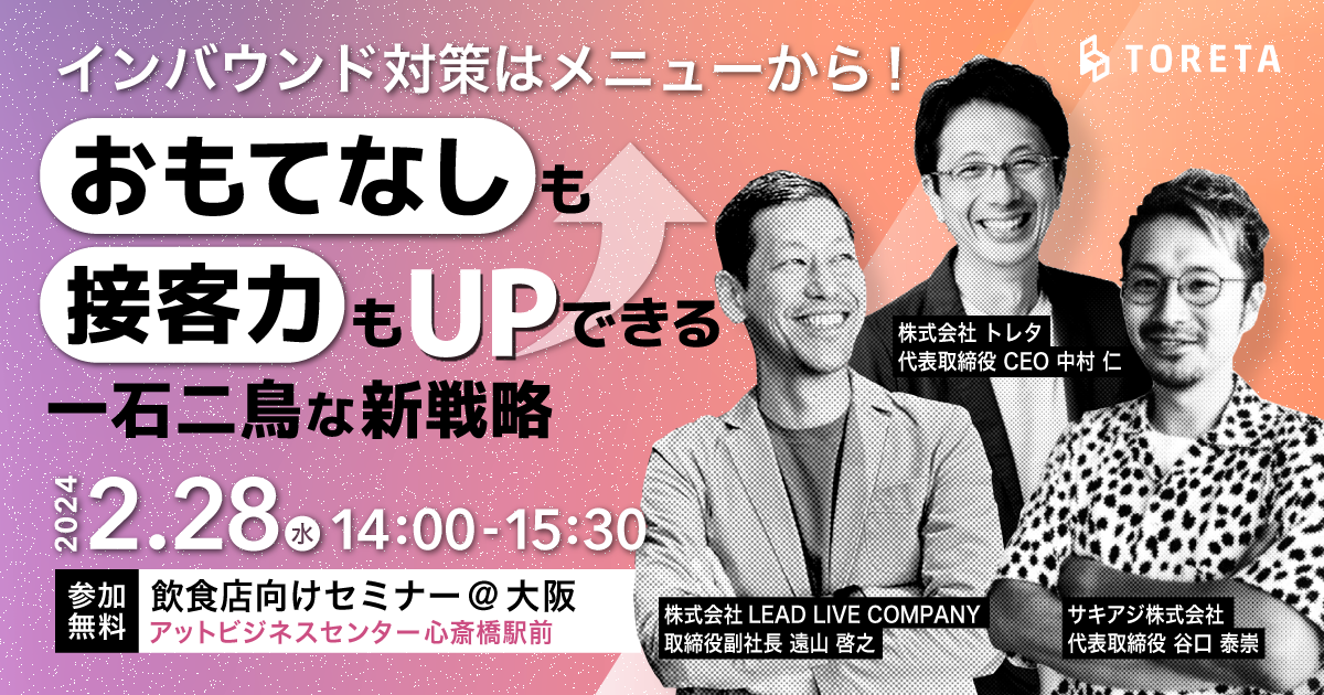 外食DXで飲食店の課題解決に貢献する株式会社トレタ(本社:東京都品川区、代表取締役 CEO:中村 仁 以下、トレタ)は、大阪府内の飲食店経営者および飲食店のシステム導入推進者向けたセミナーを2024年2月28日(水)14時より開催いたします。ぜひ、ご取材いただきたくご案内を申し上げます。