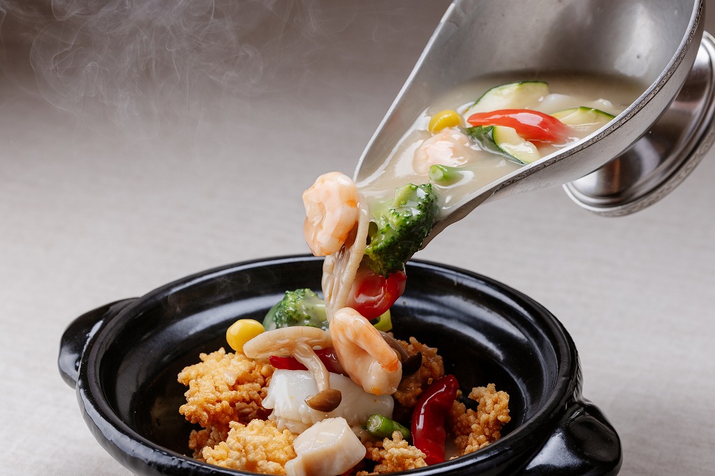 この二種類のスープの特徴を活かした海鮮白湯おこげや小籠包、フカヒレの姿蒸しは当店自慢の逸品