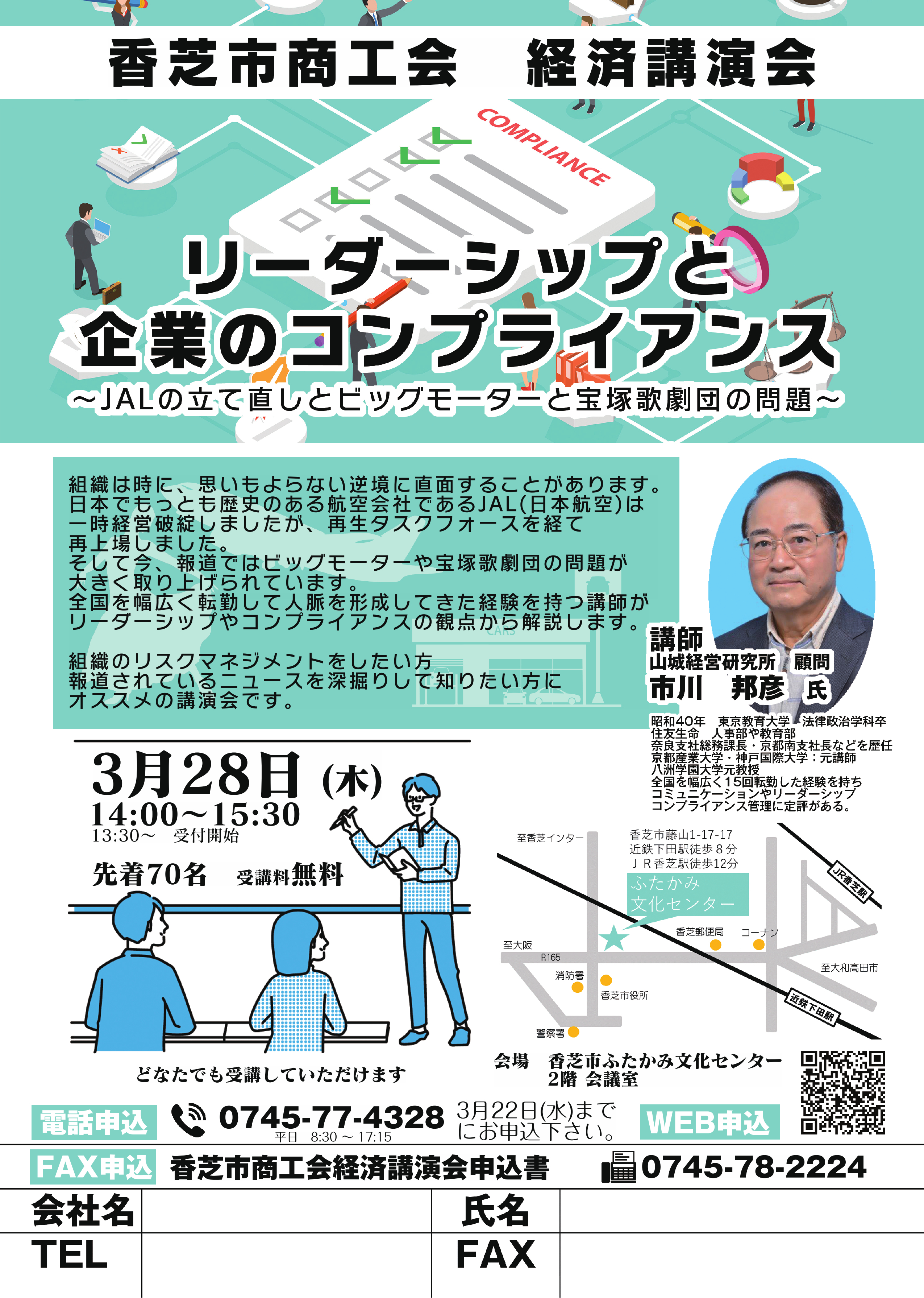 香芝市商工会(所在地:奈良県香芝市)は、京都産業大学・神戸国際大学 元講師、八洲学園大学 元教授の市川 邦彦氏を講師に迎え、経済講演会を2024年3月28日(木)に開催することをご報告いたします。