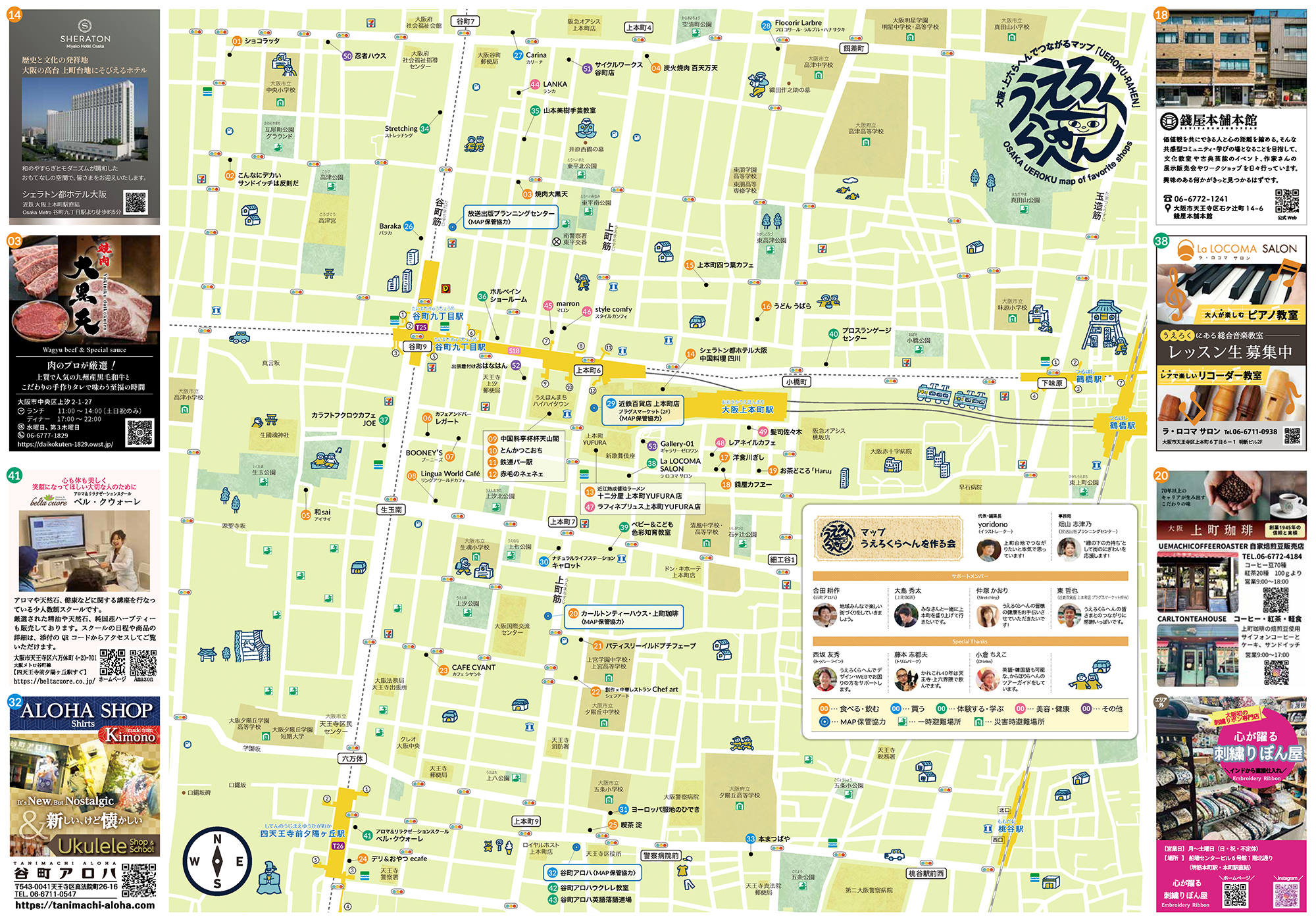 「このお店、美味しいよ~こないだ行ってん。」「ここに、こんなお店あるよ。実は中学の同級生がやってて..。」マップを指差しながらそんな話に花が咲く。1冊のマップがお店と人、お店とお店、人と人をつないでいく。それがいつか、上町台地をがっちりとつなぐ役割になってほしい!そんな願いを持ってこのマップを作っています。