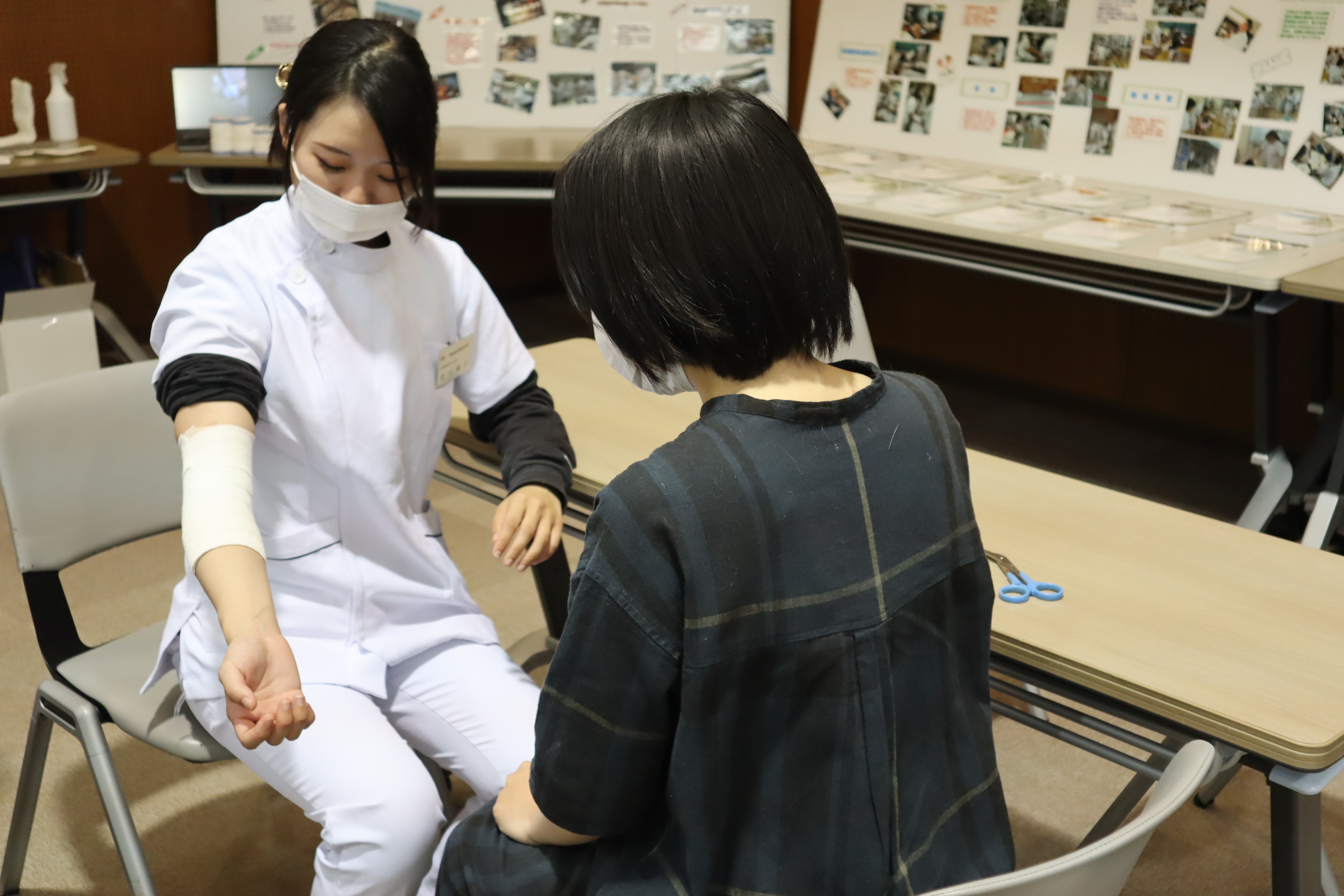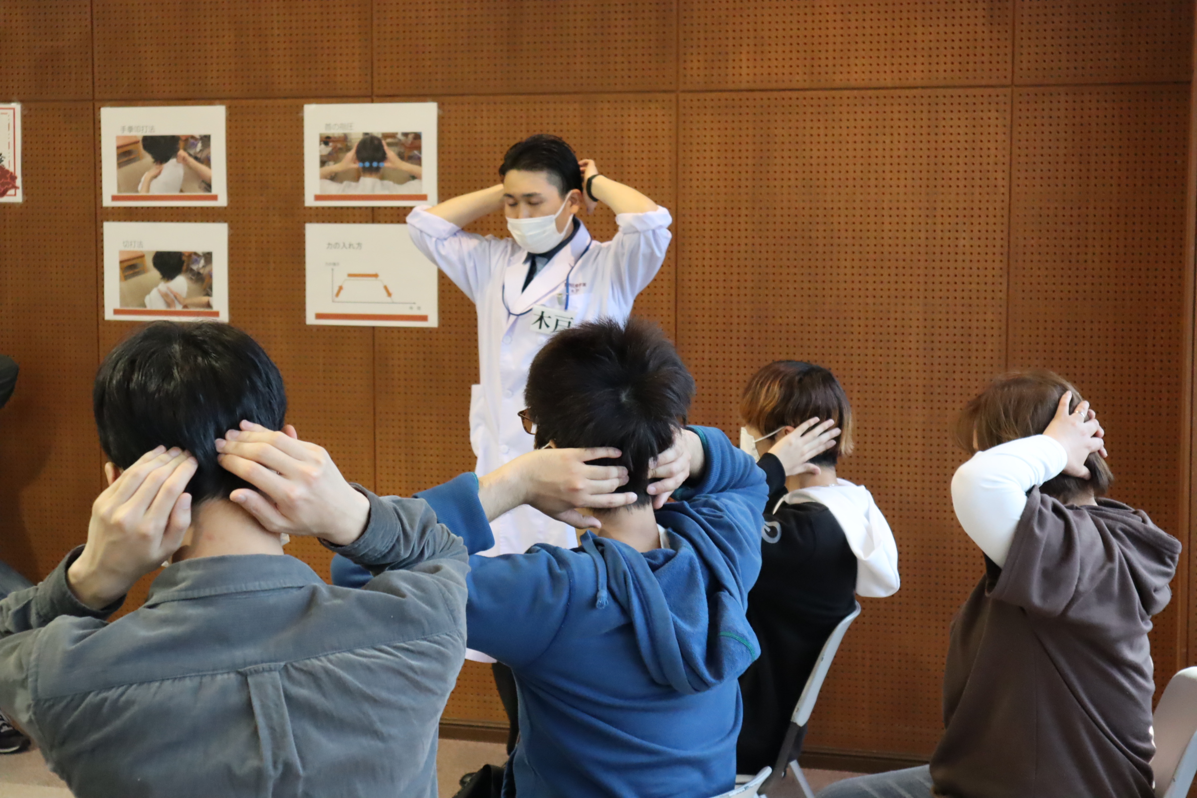 本校を卒業後、医療現場で活躍されている卒業生による研修会を同時開催。今回は理学療法士の先生による、心肺停止や呼吸停止に対する一次救命処置、AEDの使い方などの内容となっています。卒後教育と連携した学びが、このイベントでも体験できます。