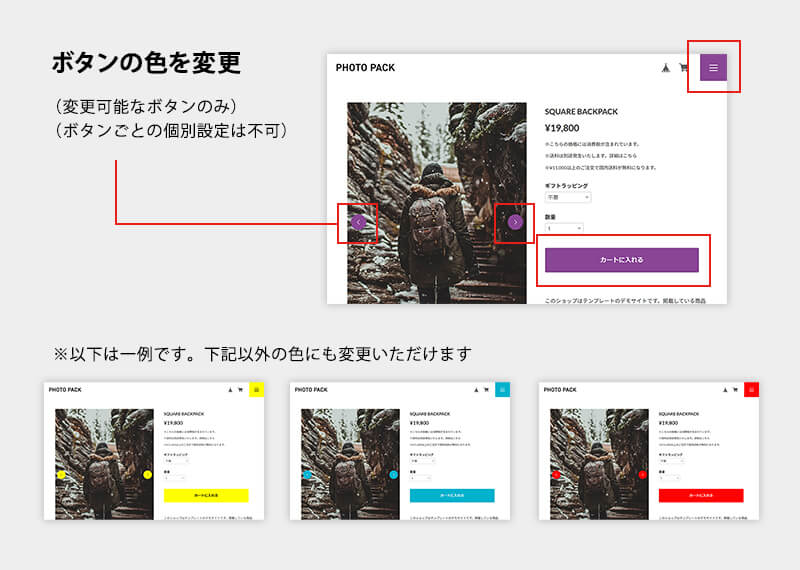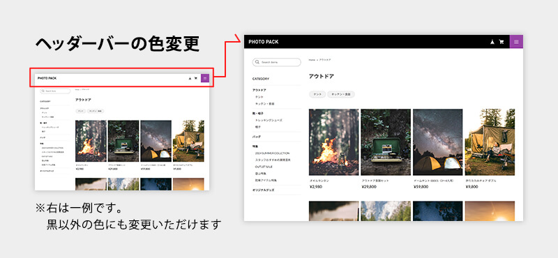 ヘッダーバーの色の変更 → ヘッダーバーの色を変更可能。ヘッダーバーを濃い色にして見え難くなった場合、BASEロゴ・カートアイコンを白に変更可能。