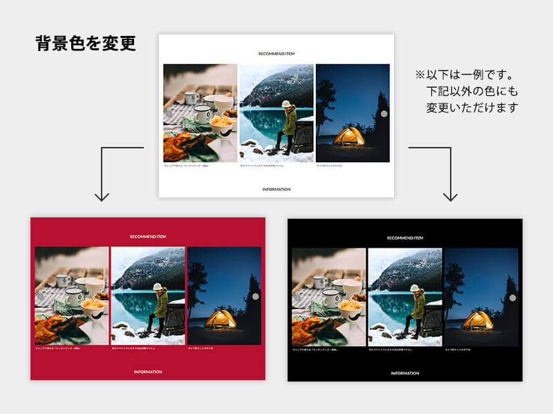 アパレル、小物、フードなど様々なジャンルで利用可能。背景色の変更、見出しのフォントスタイル変更などで多様なデザインが実現します。