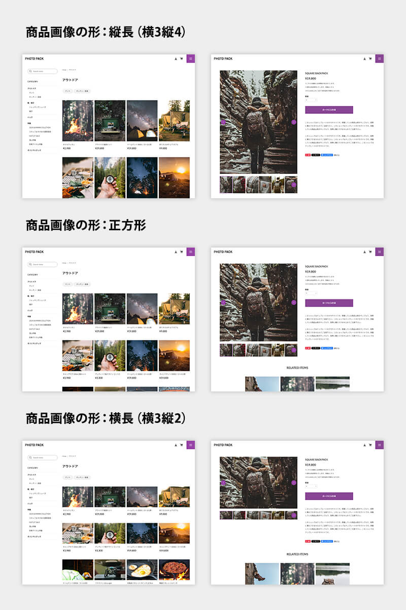 また、商品画像も「縦長(横3縦4)」、「正方形」、「横長(横3縦2)」の3種類から選択可能。商品にあわせた写真使いができます。