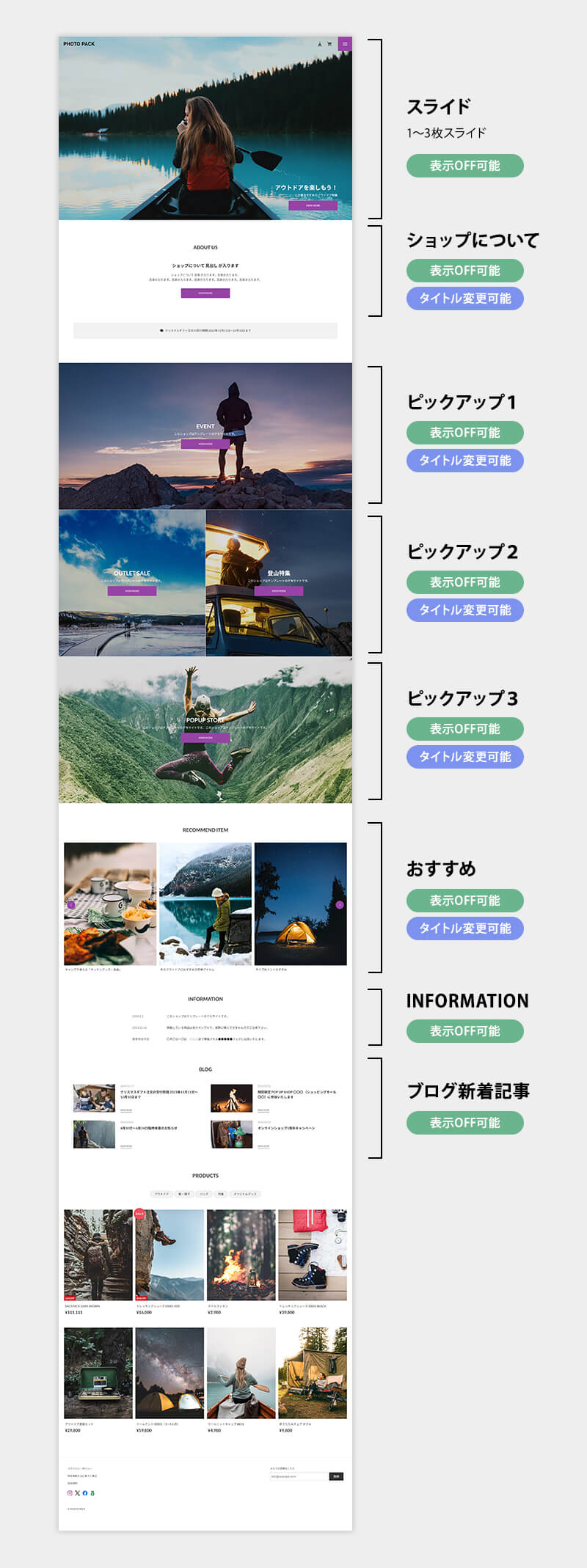 ※2 「ショップについて」「ピックアップ」「おすすめ」項目は、タイトルを自分で設定することができます。
