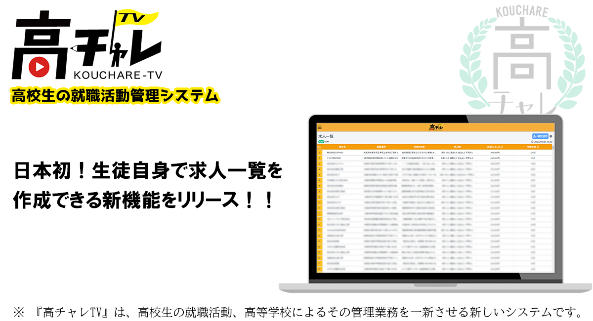 高校生の就職活動をデジタルサポートする「高チャレTV」と、企業の高卒採用を支援するサービス「高チャレ」を運営する株式会社COFFISO(本社:大阪府大阪市、代表取締役:白﨑 誠志朗 以下「COFFISO(コフィッソ)」)は、AIを活用して企業から高等学校に届く紙の求人票を高チャレTVに取り込み、生徒自身が簡単に一覧表を作成できる新サービスをリリースしました。