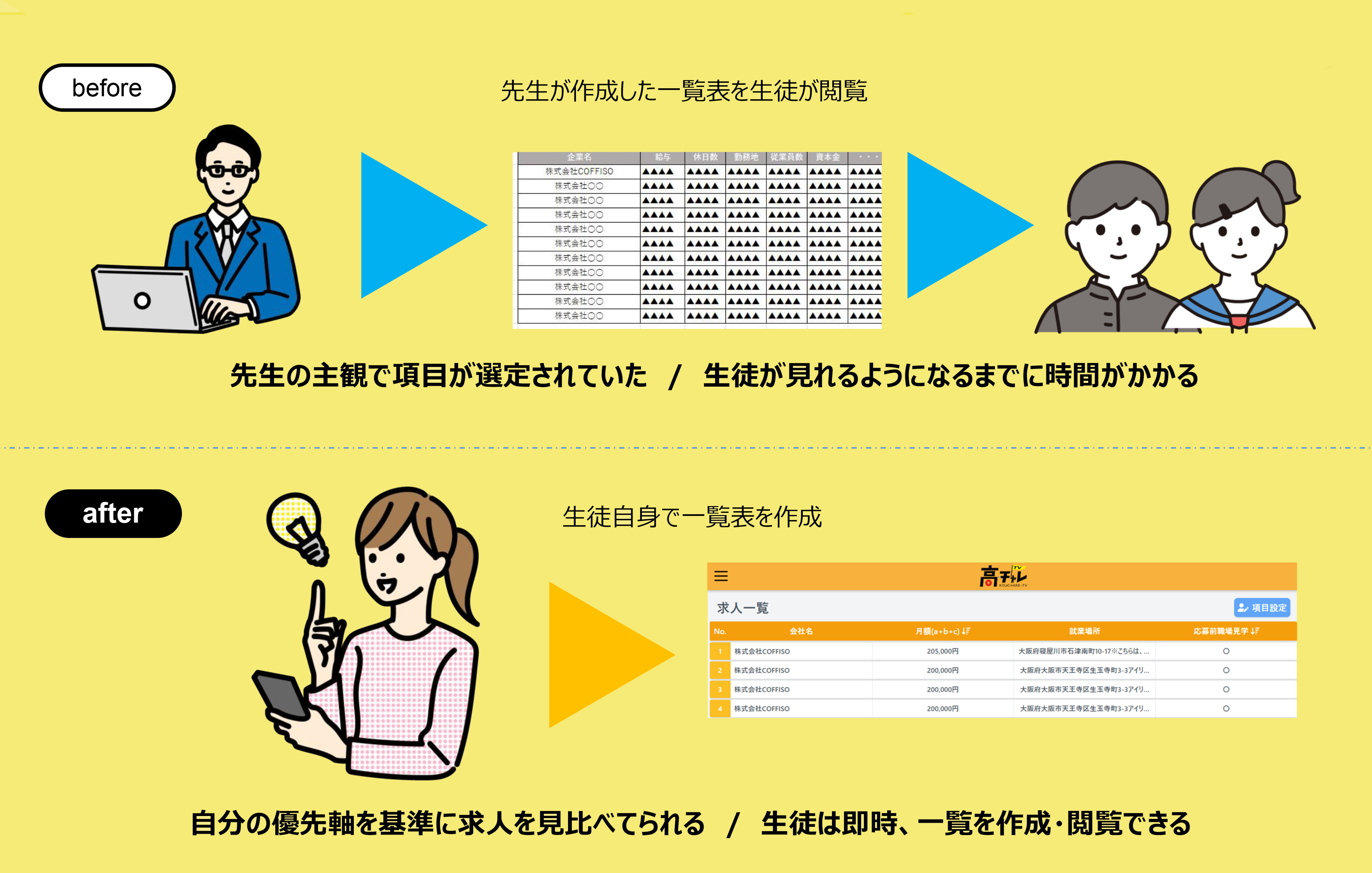 そのため、生徒にキャリア教育を含めたアクションを起こす余裕をこれ以上確保することができず、企業が学校に持ち込んだ紙の求人票をエクセルで手入力して一覧表を作成したり、ファイリングしたものを見ることしかできない状況でした。