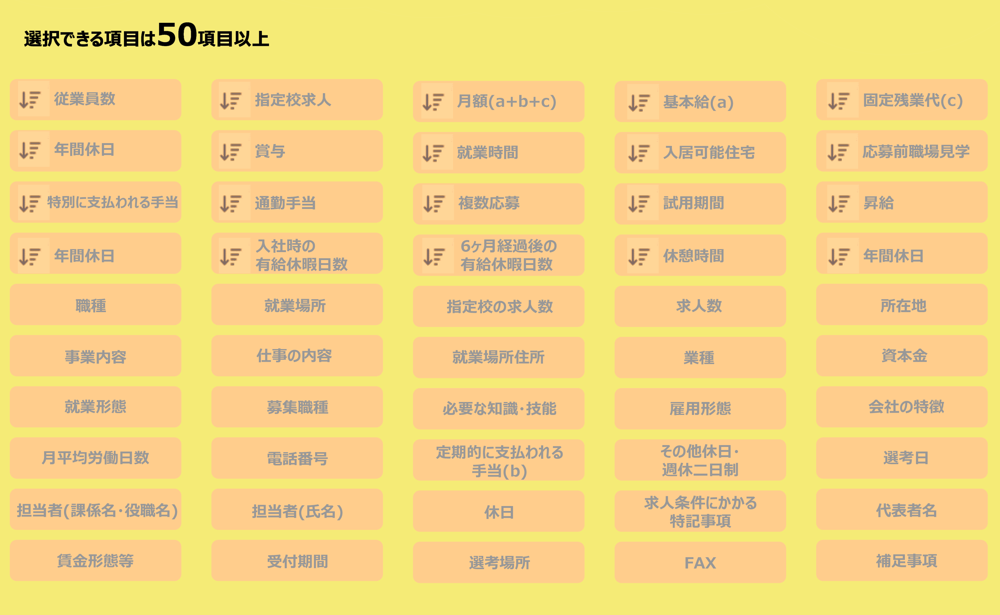 こちらの新機能により、生徒自身が一覧表を作成することができるようになります。この機能は単に教員の労力を削減するだけでなく、従来のように教員が主観で項目を選定していた一覧表とは異なり、生徒が自ら一覧表を作成することが出来ます。これにより即時に一覧を作成・閲覧できるだけでなく、自分の優先事項を基準に求人を見比べることができるようになります。