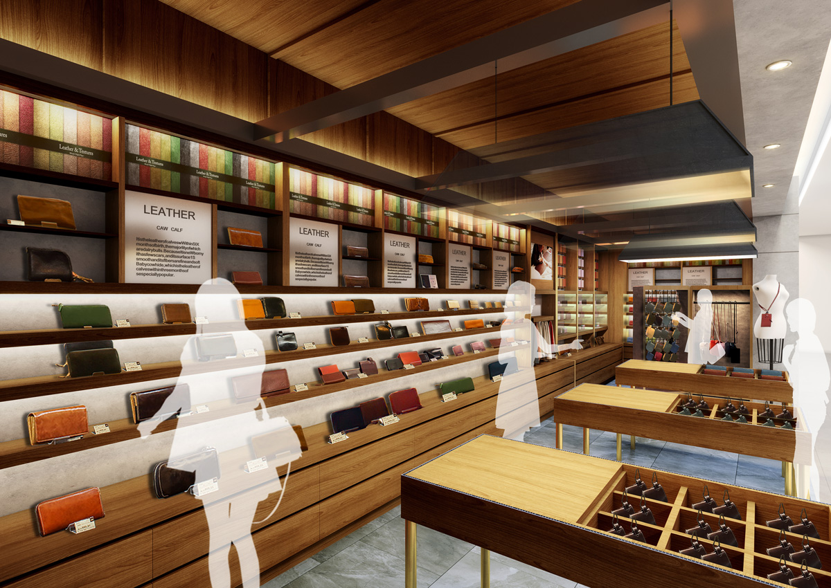 2番目のお店となります。店内にはおよそ 200 種類の革財布・小物、ショルダーバッグなど様々な形のアイテムや異なる革のアイテムをご用意いたします。
