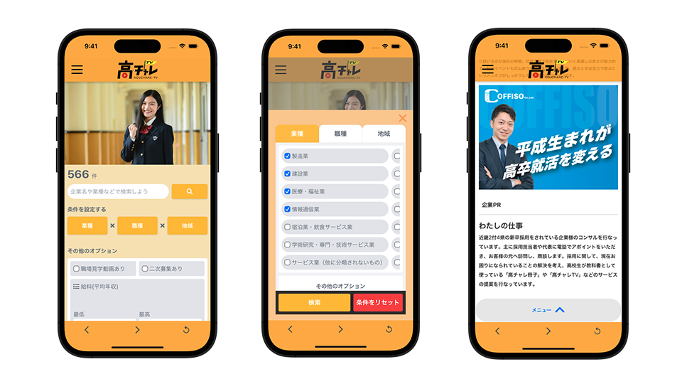 『高チャレTV』は関東圏と関西圏の高等学校に無償で提供され、教員が紙の求人票をアップロードしていただくと、生徒がスマートフォンなどのデバイスで閲覧できる機能などを備えています。